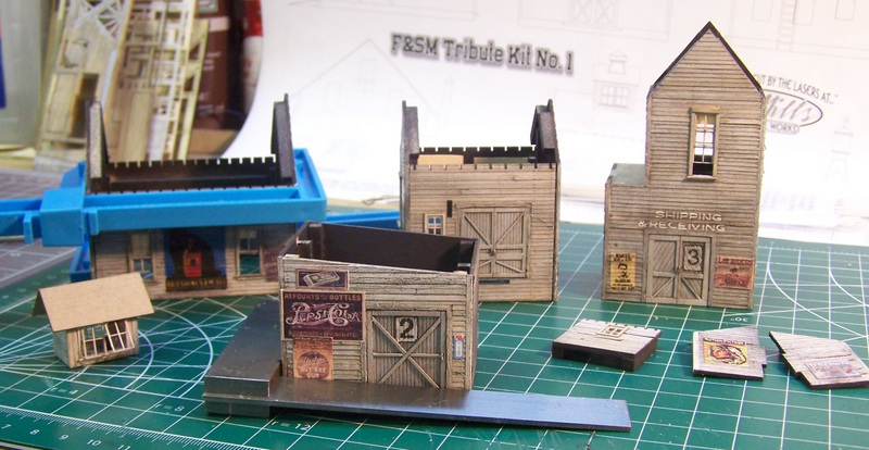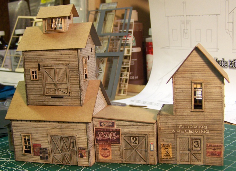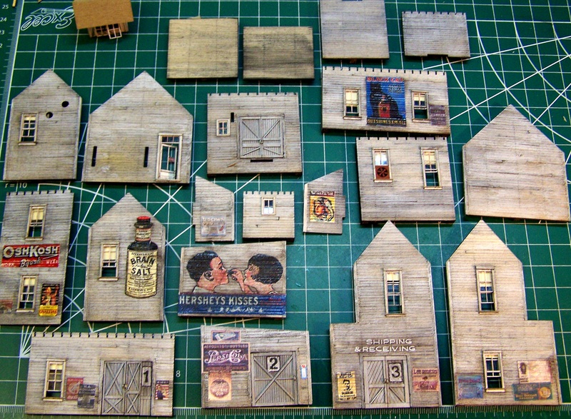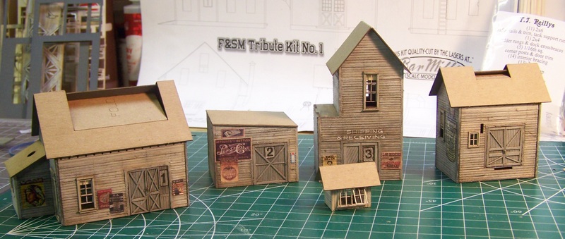 Here are the sub-assemblies with cardboard roofs installed. I made the decision to install the roofs prior to installing the roofing paper. In this case (the roof paper is to be oriented horizontally, for variety), I think it will be easier to apply the peel-and-stick strips with the cardboard roof on the buildings. prior to attaching the roofs, I sprayed the underside of all roofs with Rustoleum gray primer. In addition to providing an appropriate color for the overhang, it gives them an extra bit of stiffness.