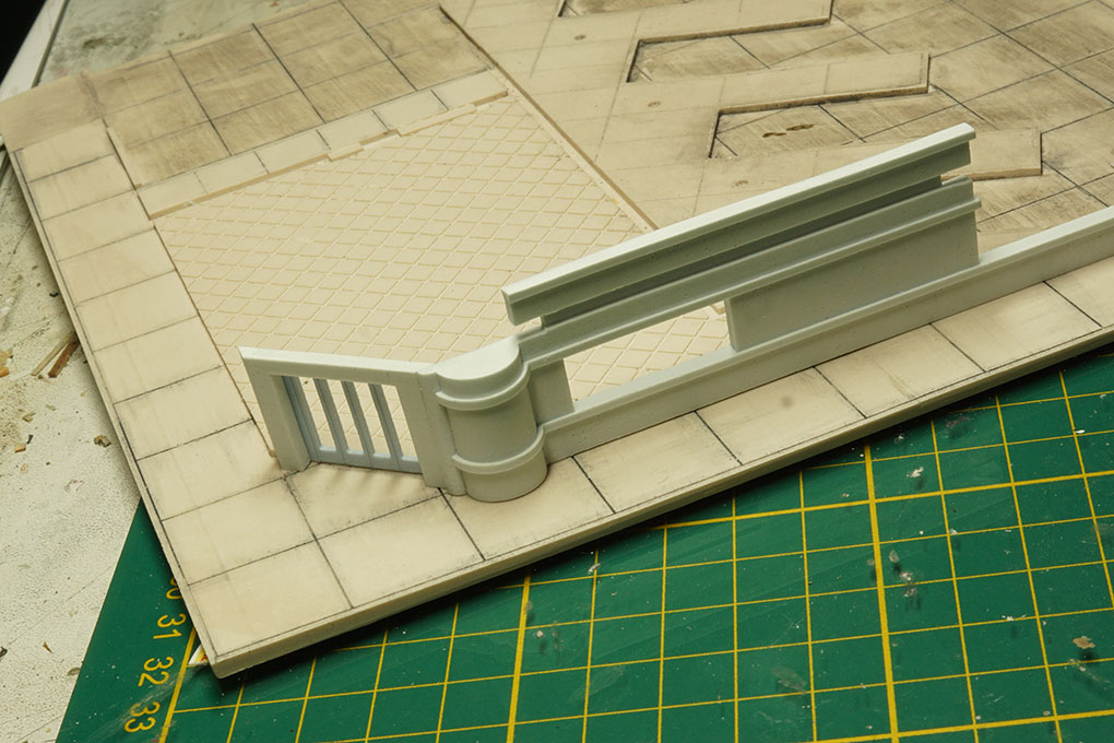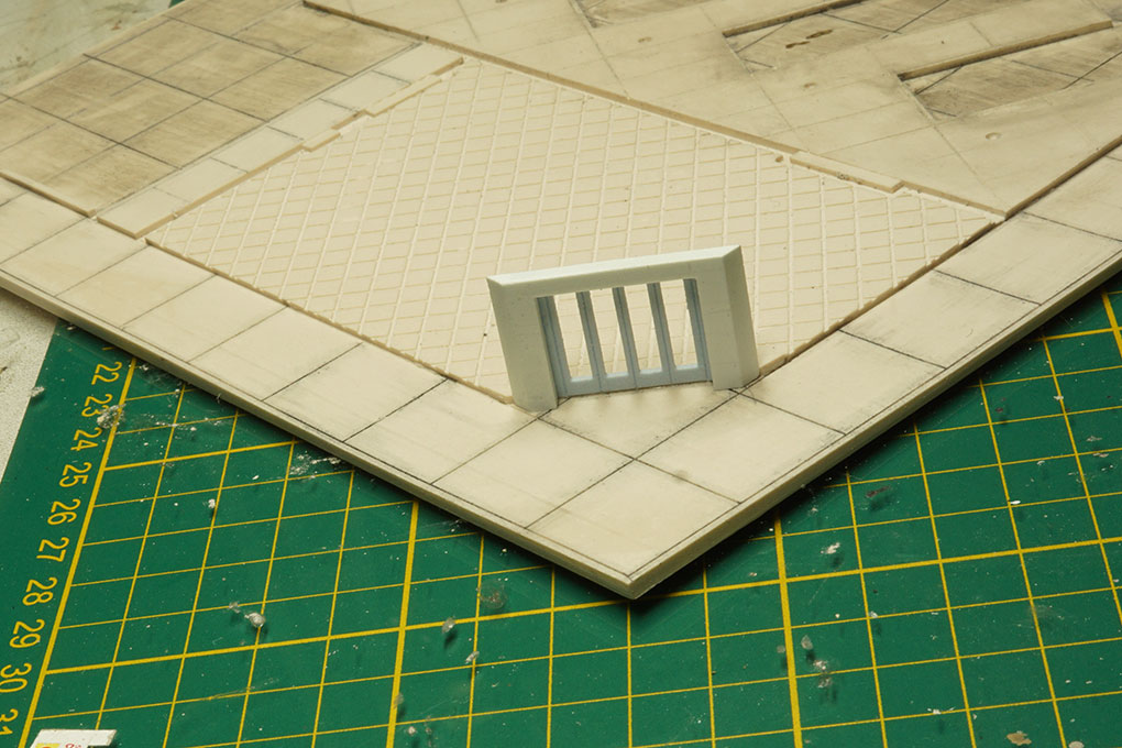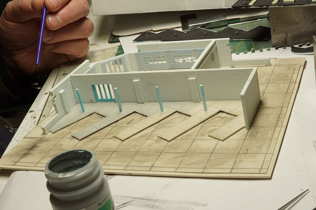 The concrete tiles on the base were all the same color, so I painted the pedestrian walkways with Badger light grey primer, it's a translucent paint so it just changed the color slightly and gave it a flatter finish. On the left has been painted and even while still being a bit wet it gives a flatter finish.