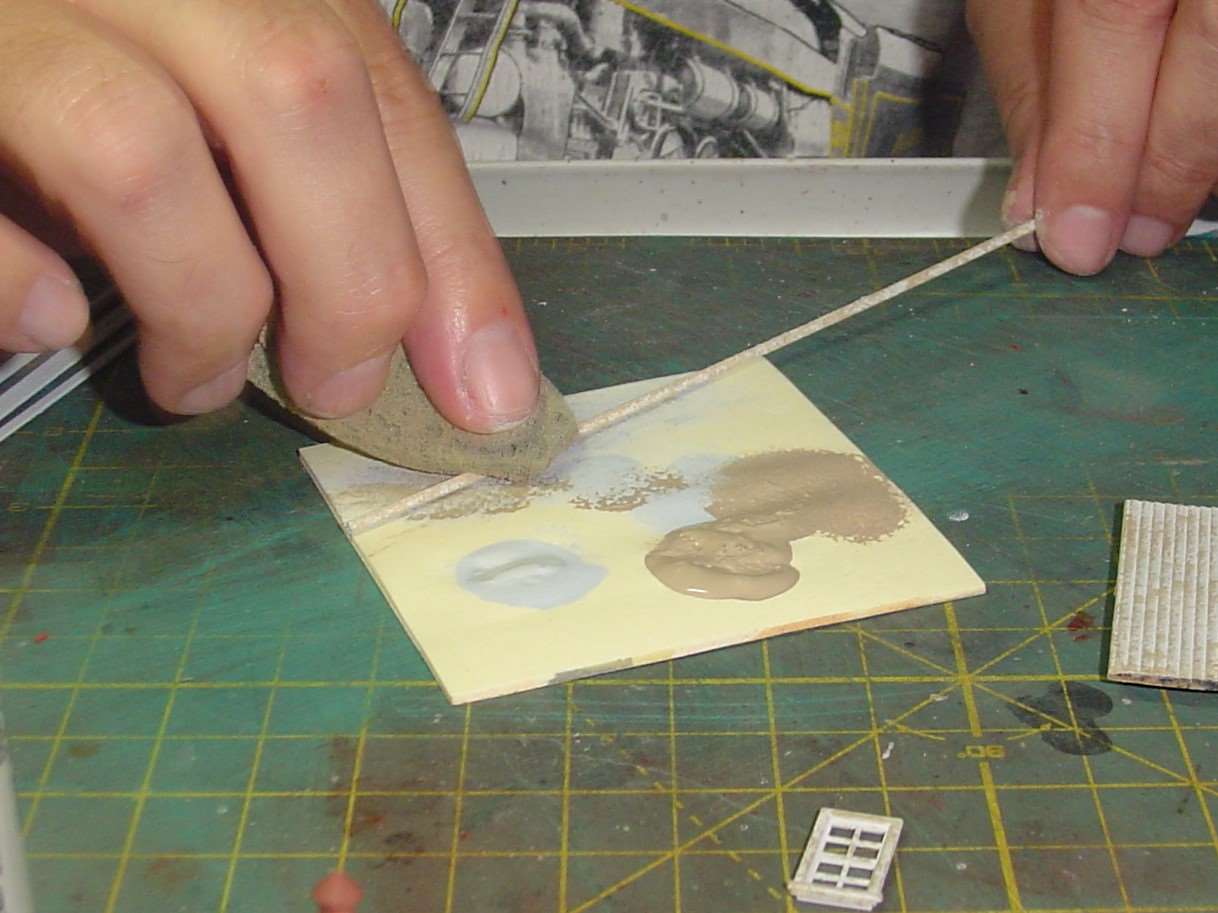 I did the same thing with a khaki tan craft store acrylic paint.  The intent this time is to emulate places where both the white paint and the primer have peeled away exposing the wood beneath.  I also did this to all of the sides of some strip wood I had set aside and painted with Reefer White for the corner posts and trim as well as the doors and windows.  I had to figure out how much of the strip wood I would need for this.  You don't want to do all of it.  Some is not painted.  Select just enough for what's needed for the main structure.  (I did two pieces of the 1/16" square and three of the 2" x 6").