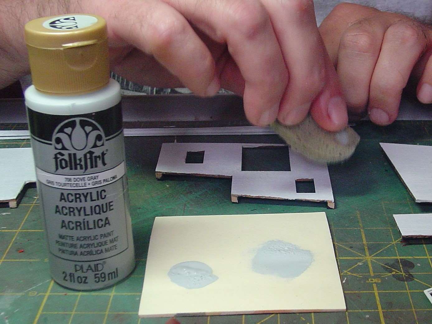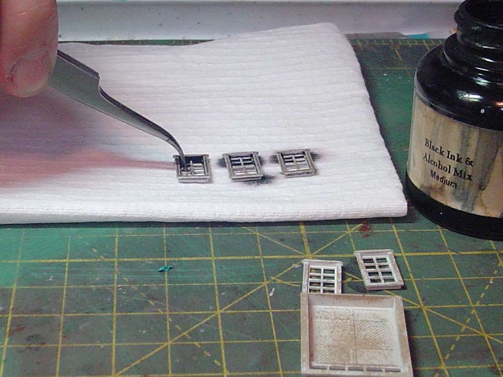 I dipped the doors and windows in my A&I mix and set them on a paper towel to dry.  They dry lighter than they look but they can also be adjusted at this stage by brushing with a brush dipped in straight A (no I) and/or blotting lightly with a paper towel to pick up some of the excess A&I.  Any overly heavy spots from the gray/khaki sponge effect can be lessened or washed away by gently scrubbing them with a cotton swab or fine brush dipped in the A&I mix or just straight A.  This is a very forgiving technique that allows for adjustments long the way.  Same is true for the walls and trim pieces.