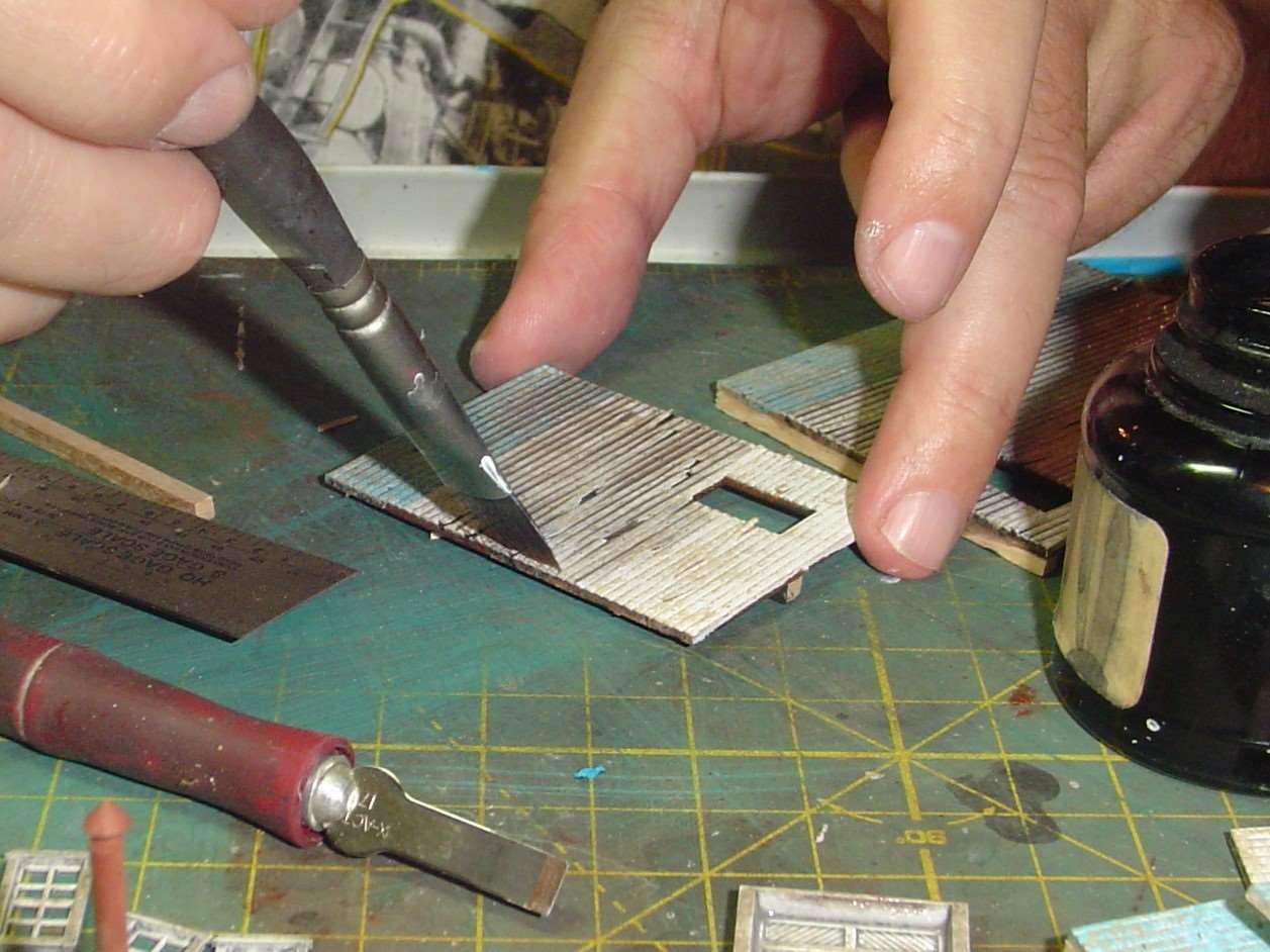Once again, prior to applying the A&I wash, I chose to beat up the walls by slipping a chisel blade underneath some clapboards and lifting them up. I even twisted the blade and broke off a few small pieces here and there.  Try not to do the section of the large wall where the sign will go.  That can be done after applyling the sign.
