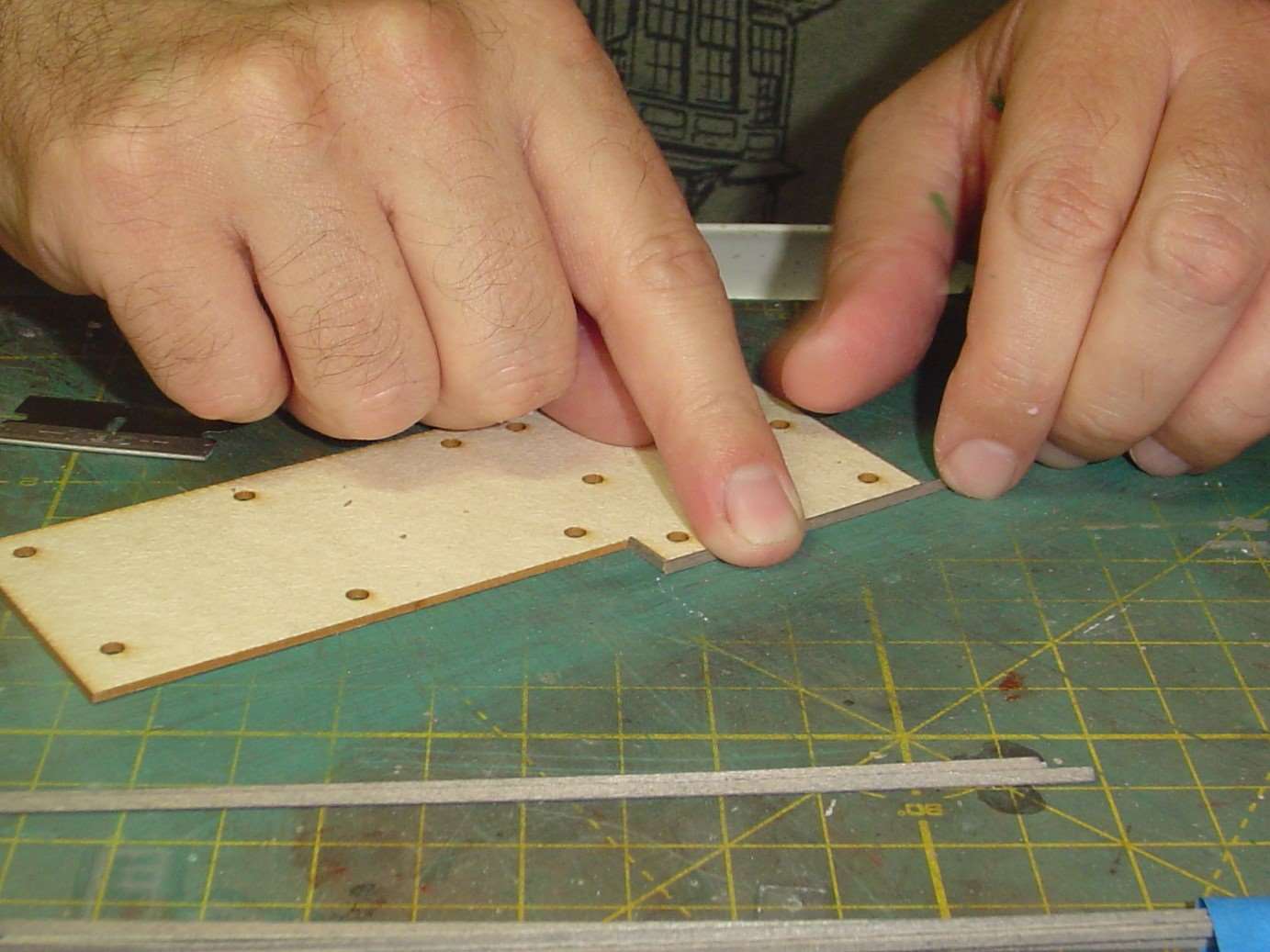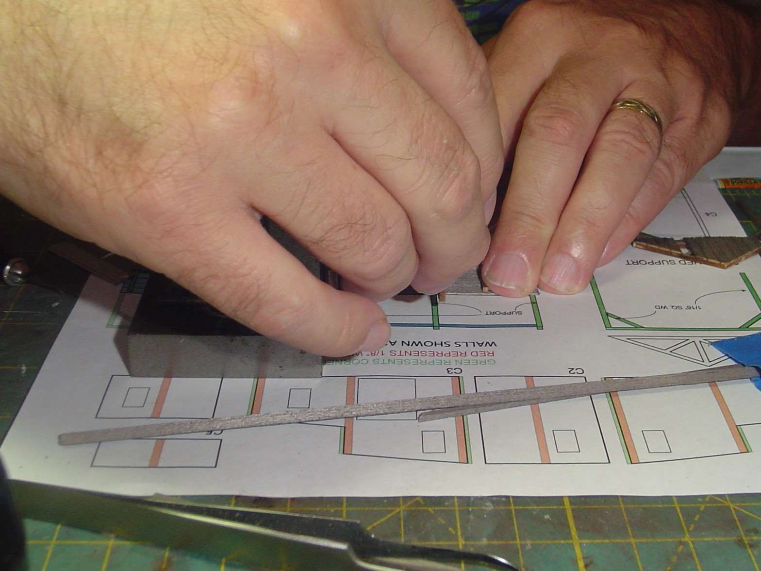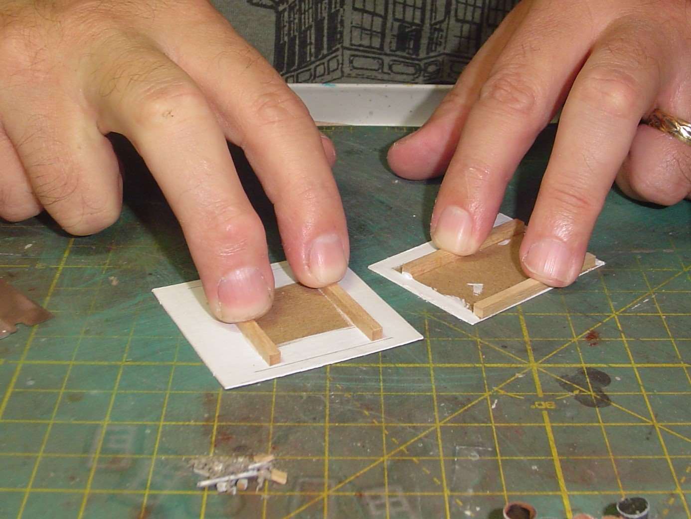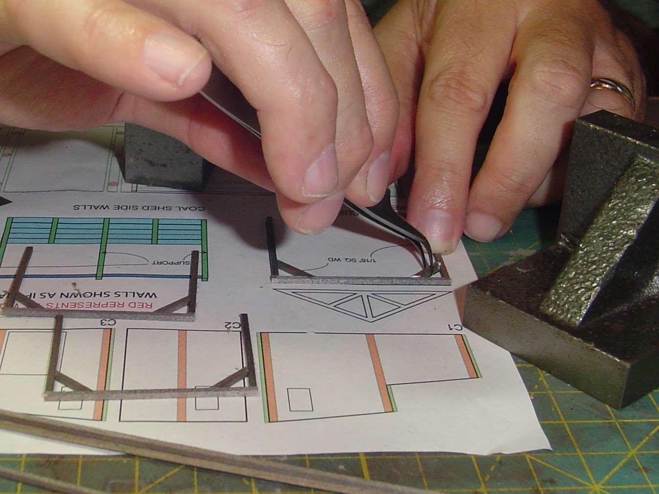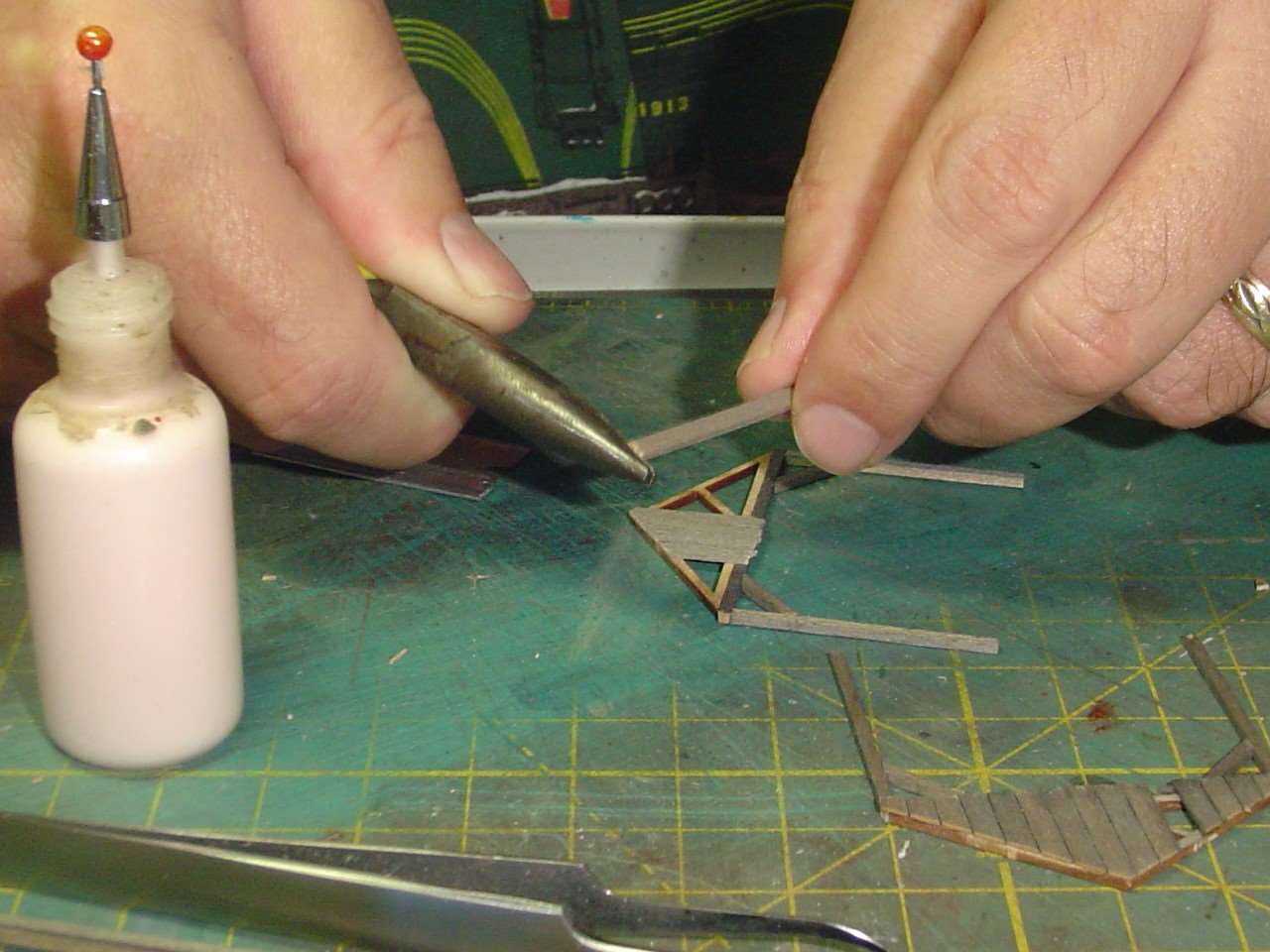 My fingers kind of block the view here but I assembled the side walls over the template.  One thing I'd recommend, or do over if I were to build this kit again, is to make the side walls about 1/16" to 1/8" shorter.  The structure fits, barely, on the deck but the short front wall, when added, actually doesn't attach to the deck.  It's just hanging there.