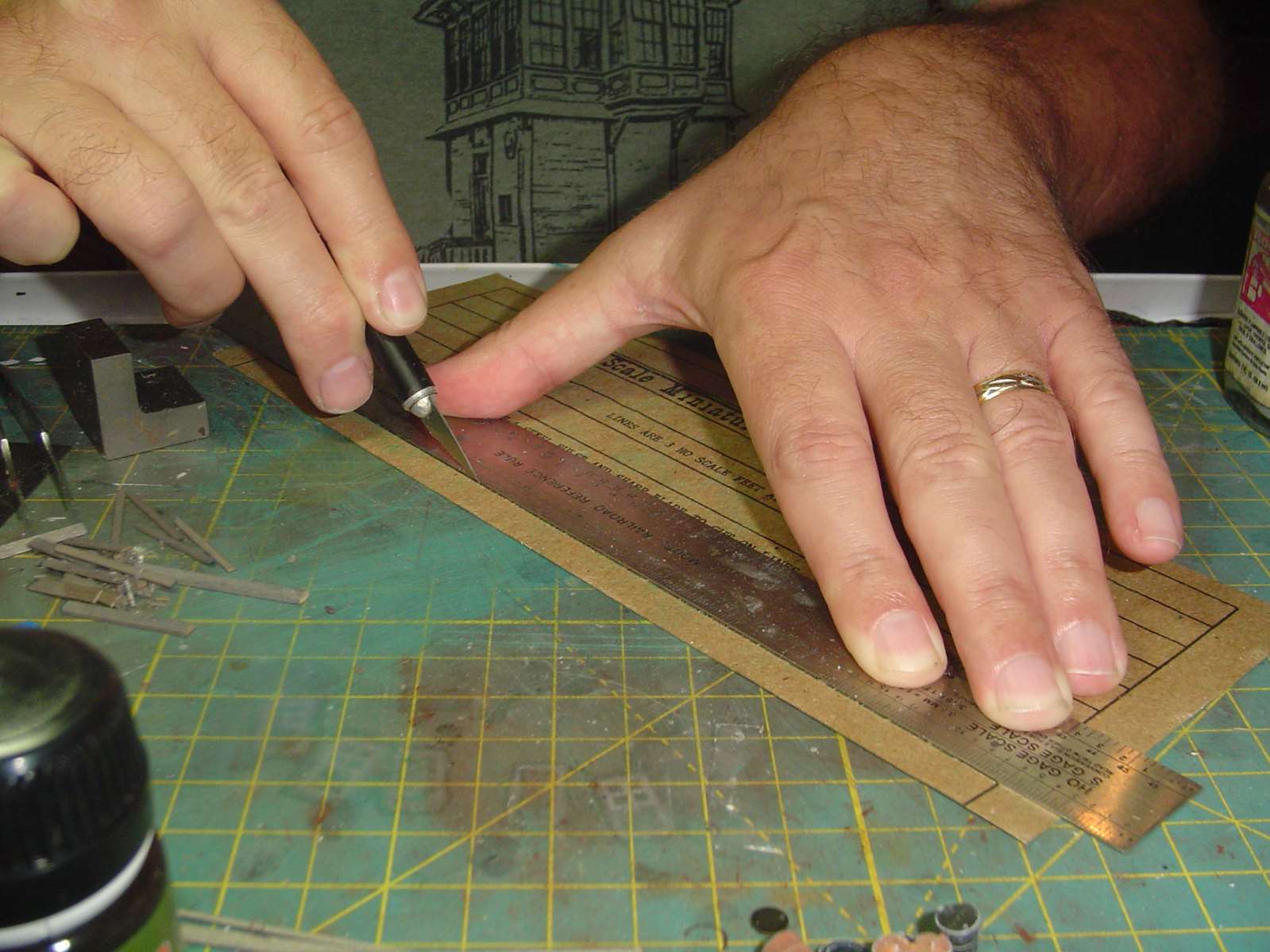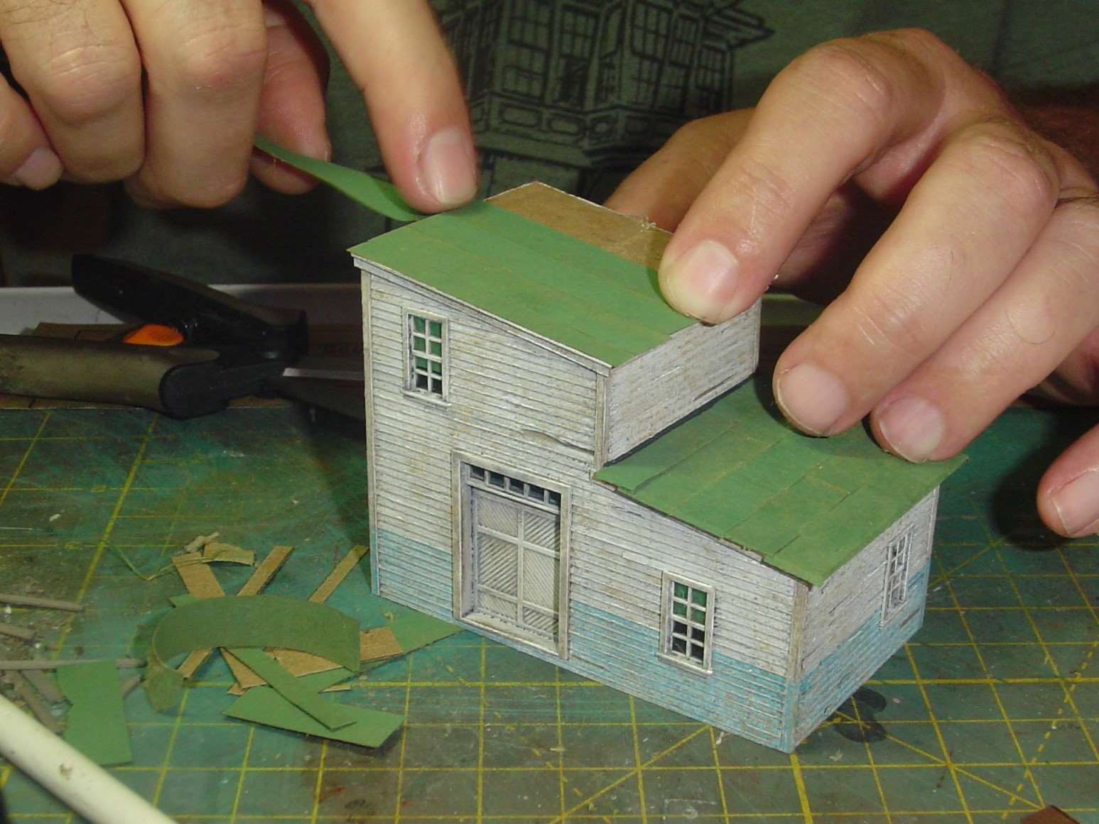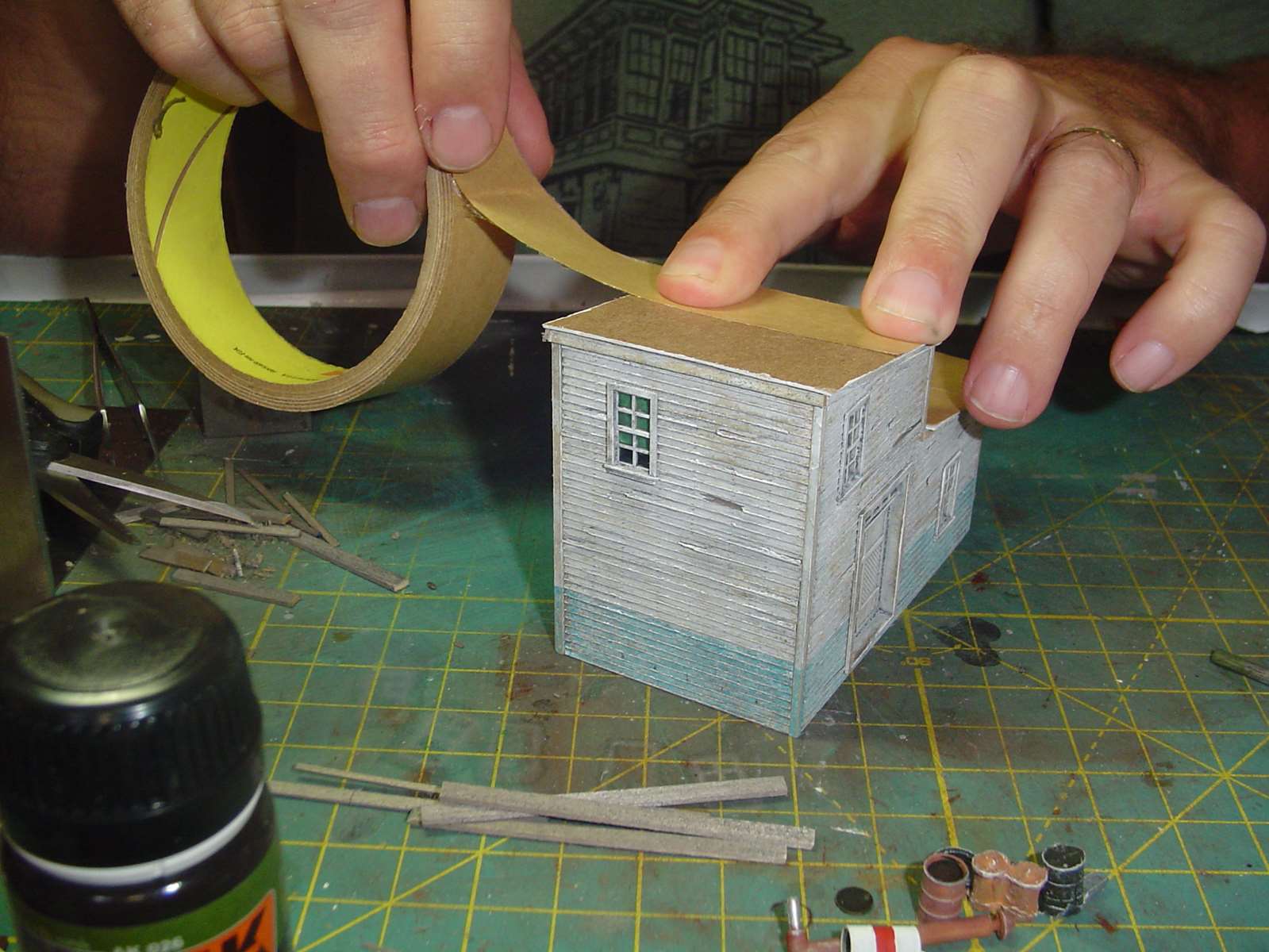 Then trim to fit with a scissors or razor blade.  When you're ready you peel off the carrier sheet and what you have left is a cardstock roof that's sticky like tape is.  All you have to do it place your roofing material on it and rub it a little bit to adhere.  No glue smears, etc.   ;)