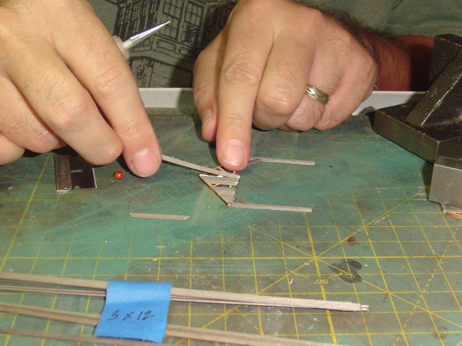 I thought I'd try something different to get the bottom edge to look a little ragged.  Rather than cutting them with a razor blade I put the strip wood in a pair of needle nose pliers and snapped it off.