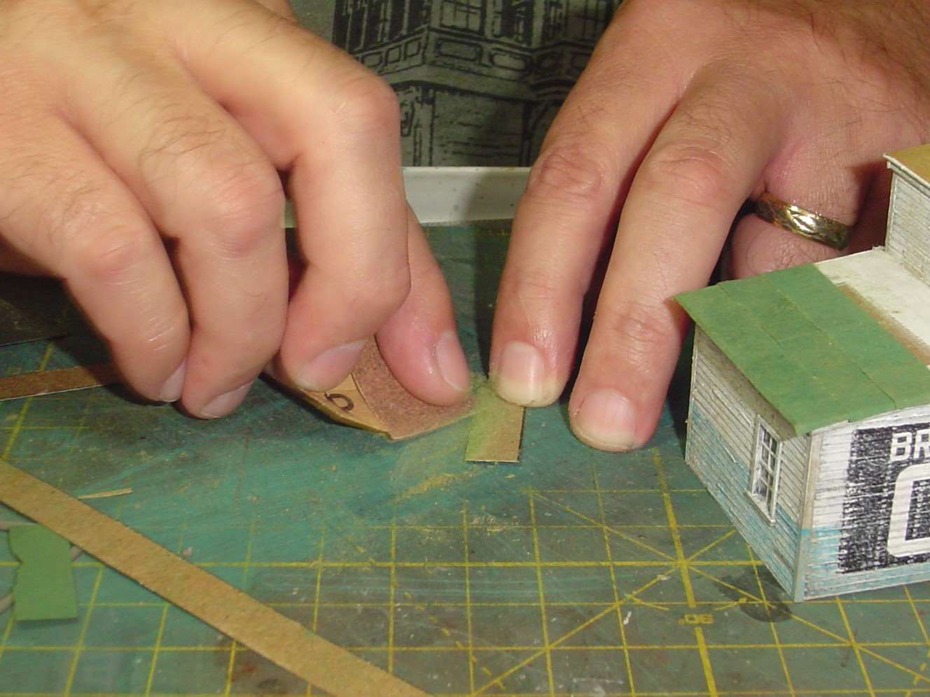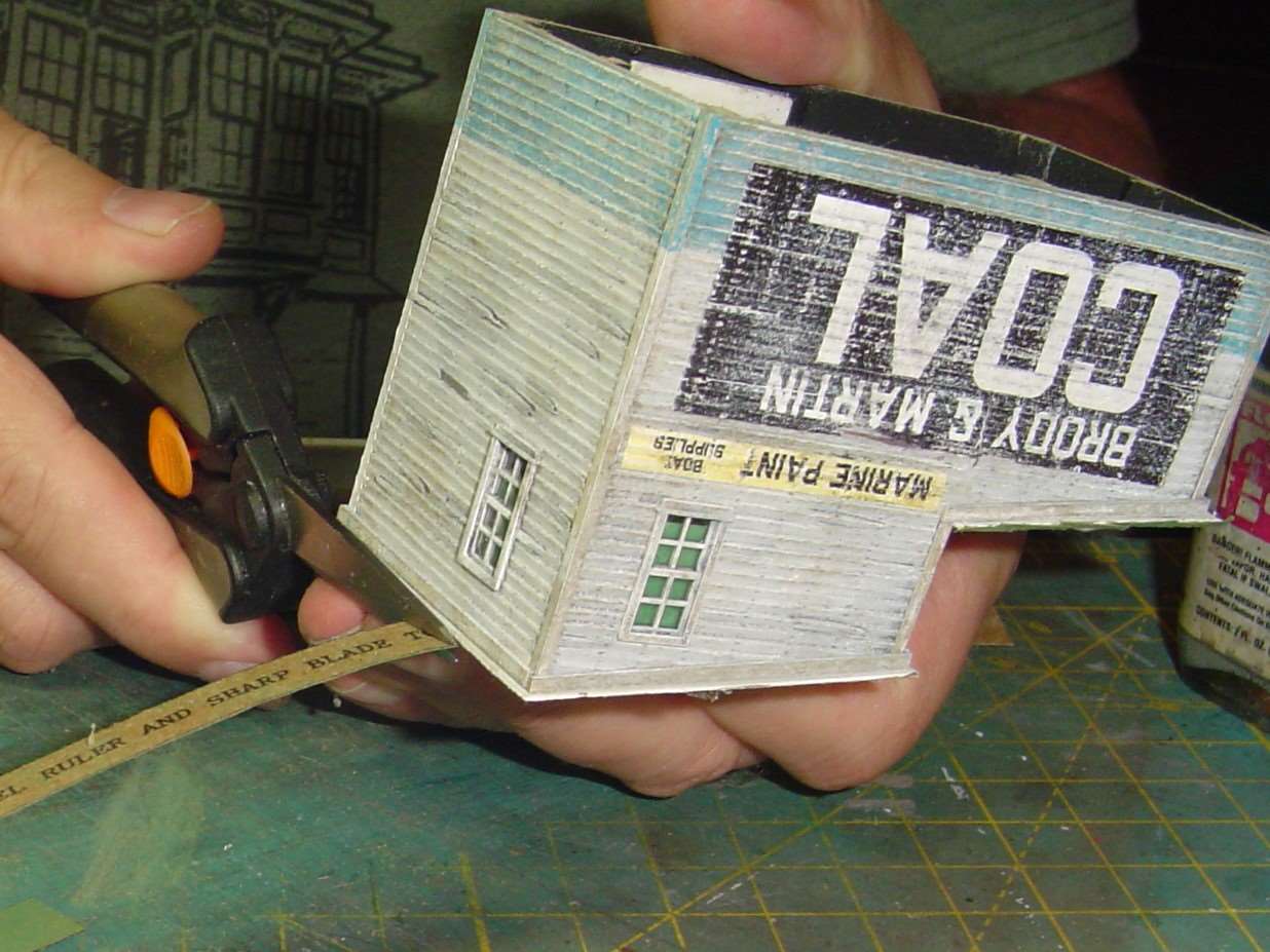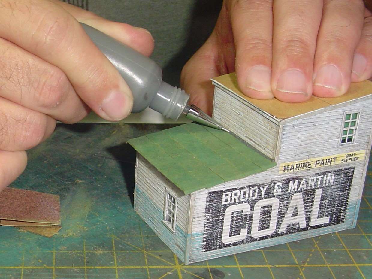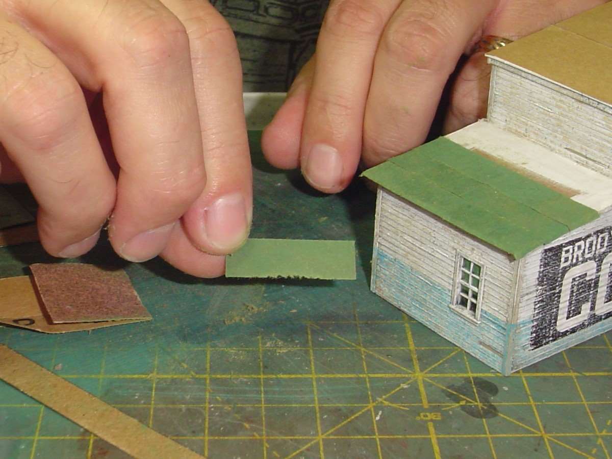 I like the effect I've seen Dave K. get when he sands the lower edge of the rolled roofing to represent wear so I thought I'd give it a shot.  I sand it, from the unpainted side of course, until the edge looked a little ragged.