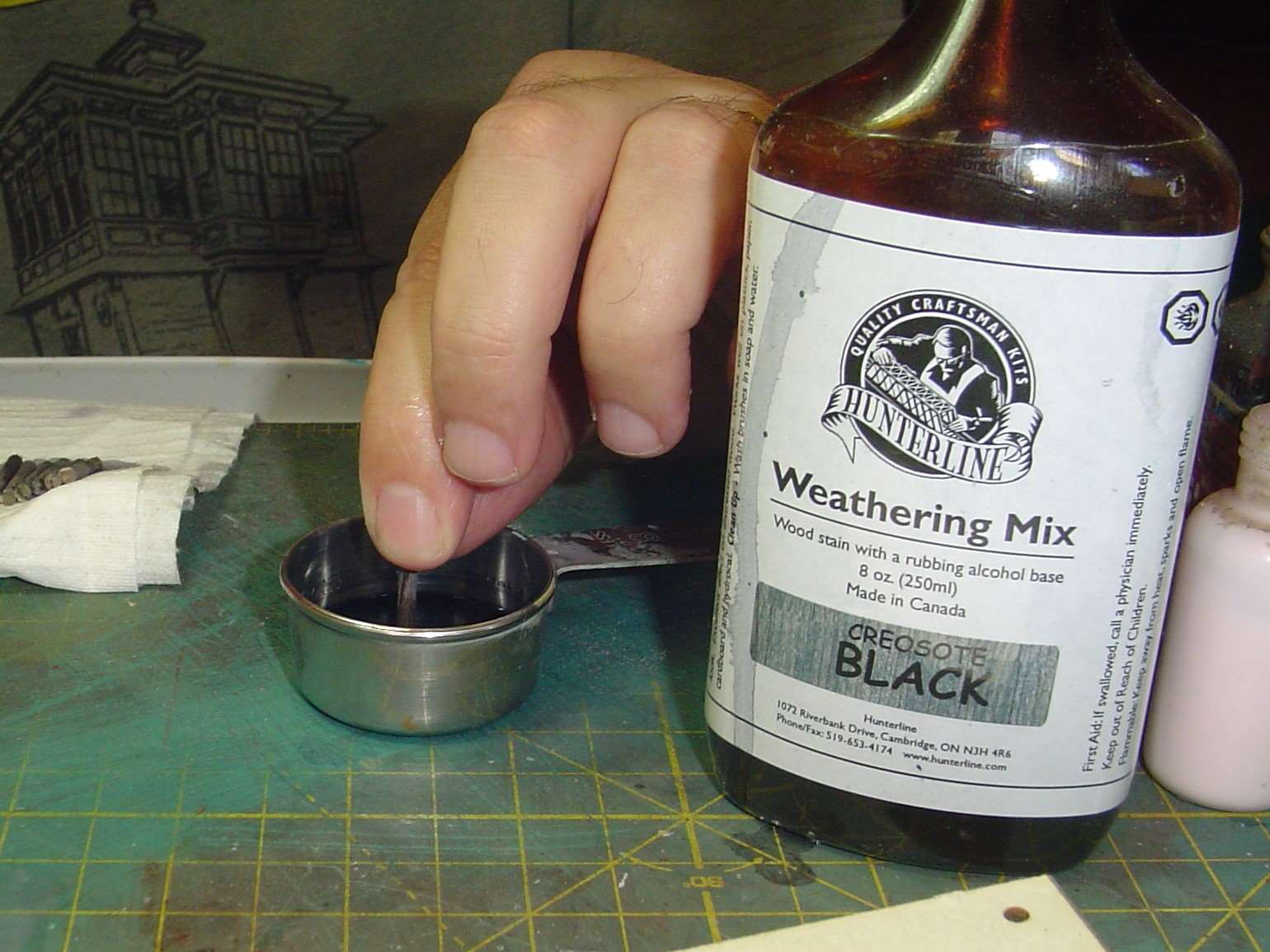 I had previously stained the dowels for the pilings with HunterLine Light Gray Weather Mix.  But I wanted the bottom to be darker (water logged) than the top so I stood each up in about 1/4" of HunterLine Creosote Black and let it wick up the dowel.