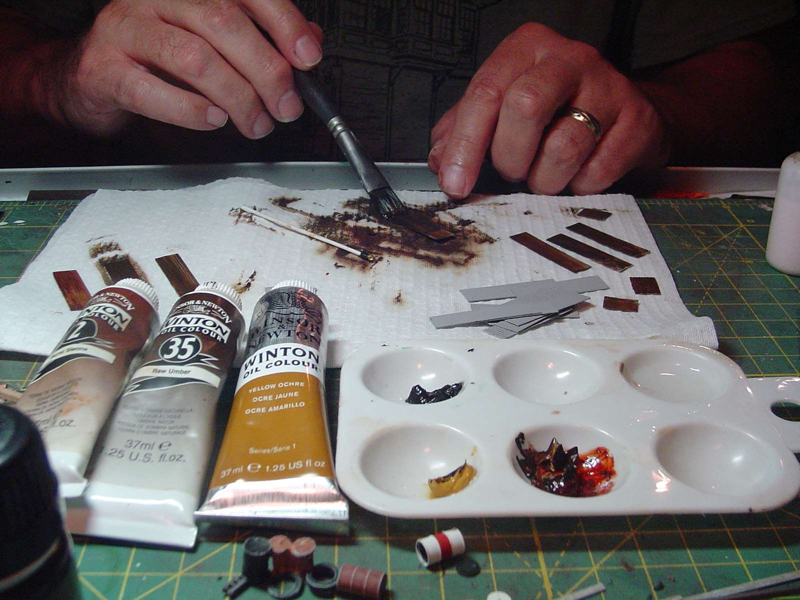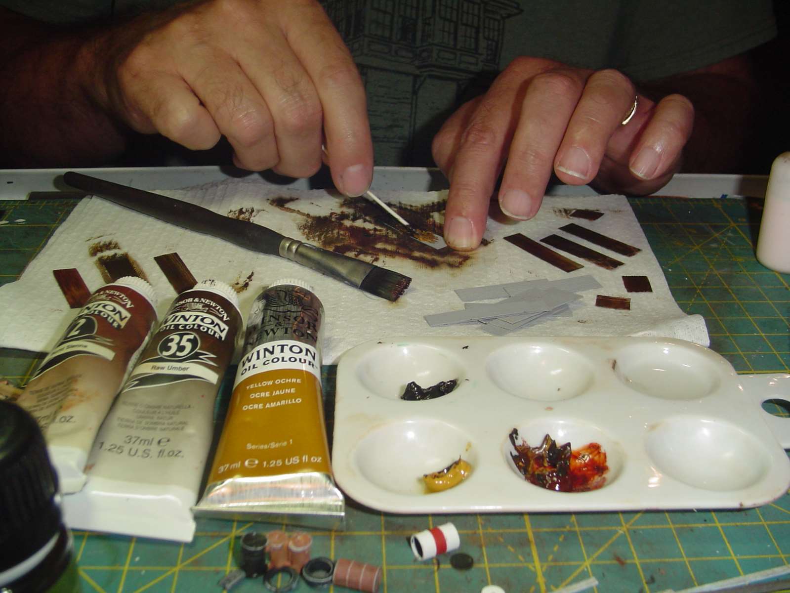 I had previously cut the corrugated roofing panels to the lengths indicated in the templates.  I painted them with oil paints Umber's and Sienna's and applied some rust colored powders to them to make them look like crusty, rusty panels.