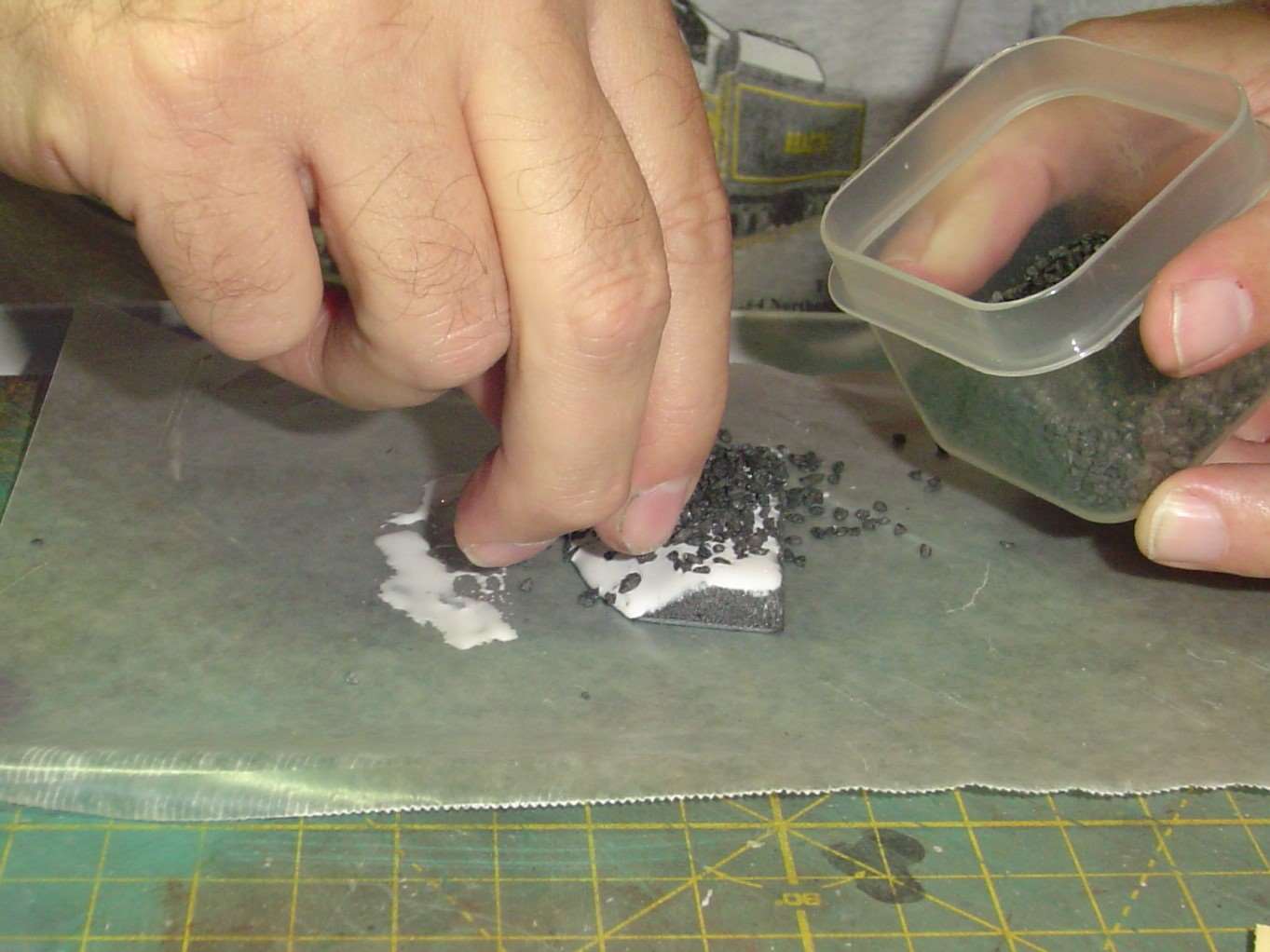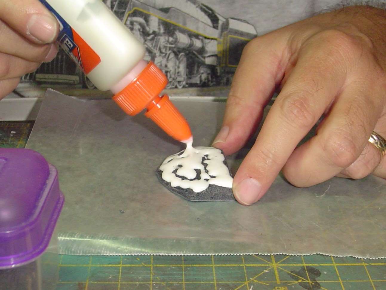 Over a piece of wax paper I covered the Gator Board coal pile with Elmers White Glue.