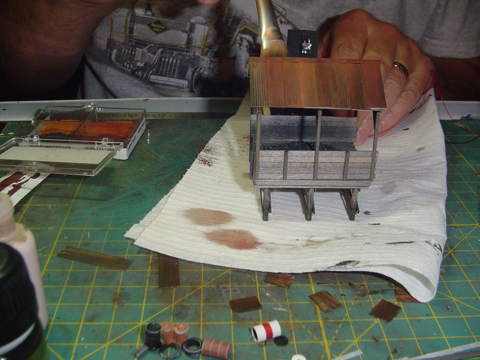 After the roofing panels were glued in place I applied some rust colored powders.  I've done this both ways, applying the powders while the oil paints are wet and, like here, after they've dried.  The effect is about the same.
