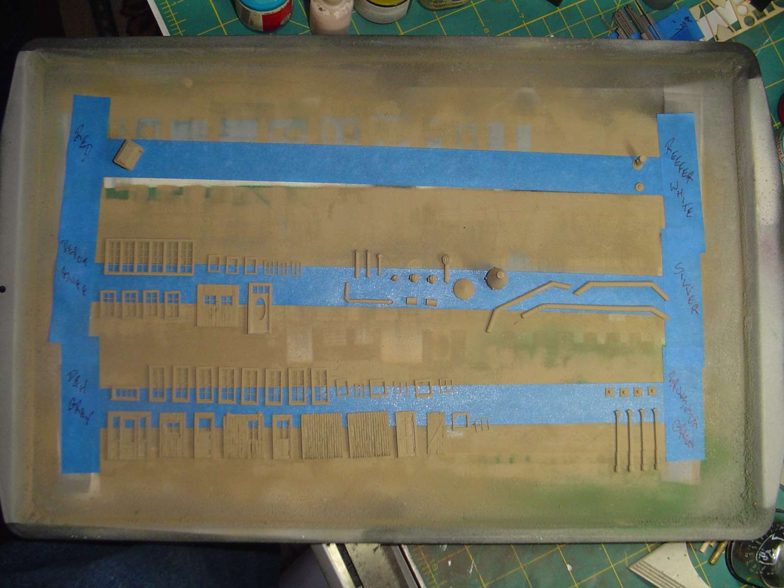 Skipping ahead little bit.  I put everything I want to airbrush on a metal tray using some strips of painters tape taped upside down (sticky side up).  I've already done that and primed everything.  At this point I picked out the parts that I want to paint specific colors with the airbrush and grouped them together along with a not as to what color I want to use.  When I paint them this way I'll use paper towels to cover up the parts that I don't want painted the current color I have loaded in the airbrush.