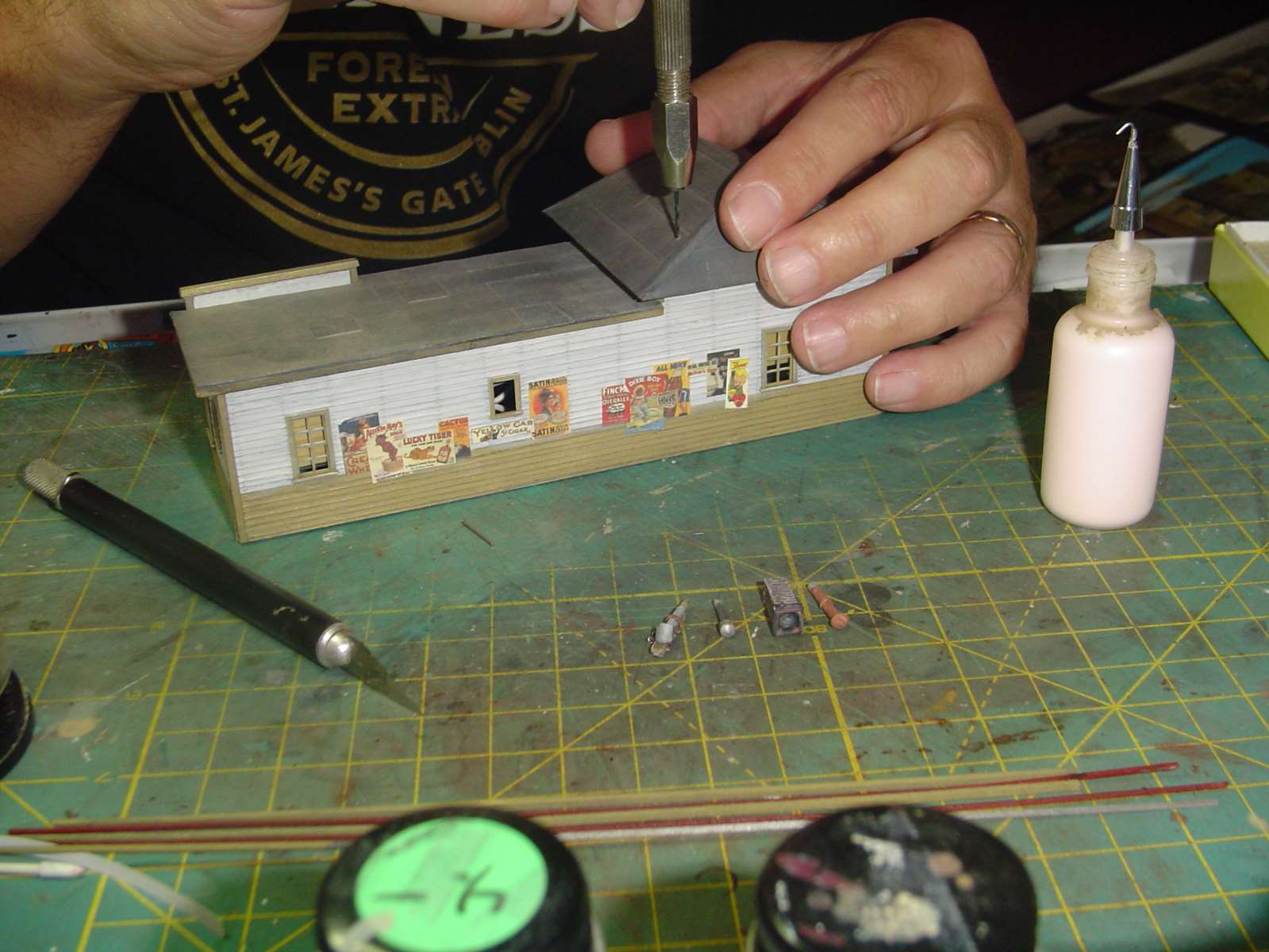 This was done the same way as the main structure.  The 3M Transfer tape was exposed and then strips of the roofing material were add to the roof.  It got painted afterwards.