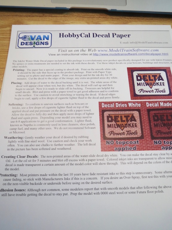 At $18.99 for five sheets (8.5 inches by 11 inches) it is not cheap. Most likely there are other brands less expensive but five sheets will make a lot of HO scale decals. I used white so the blinds show completely (can't print white). I tried clear Testers decal paper (with bonder) and it just did not work.