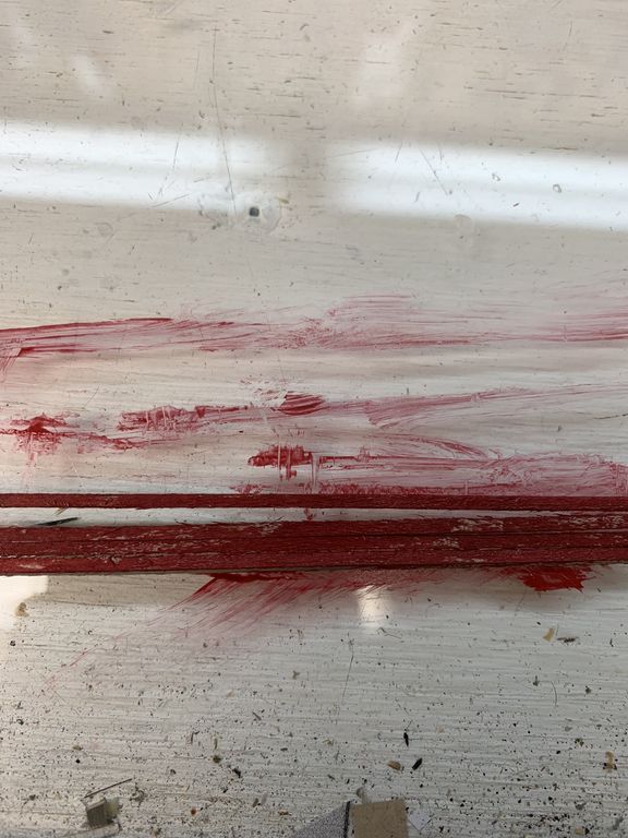 The wood trim is painted red using a wet paintbrush applied very poorly intentionally missing spots again. This is a technique I learned from Brett Gallant. He calls it "Wet Brushing".