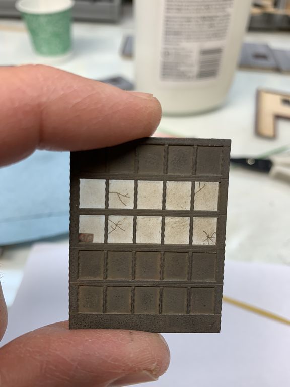 I added some signs and the window glass to the top row of windows. I'm still going to add a few more signs to the front. All the signs were weathered with chalks. I didn't use any A&I on the signs. The chalk dirties everything up but still keeps it clear enough to read. Sometimes you lose clarity with A&I.