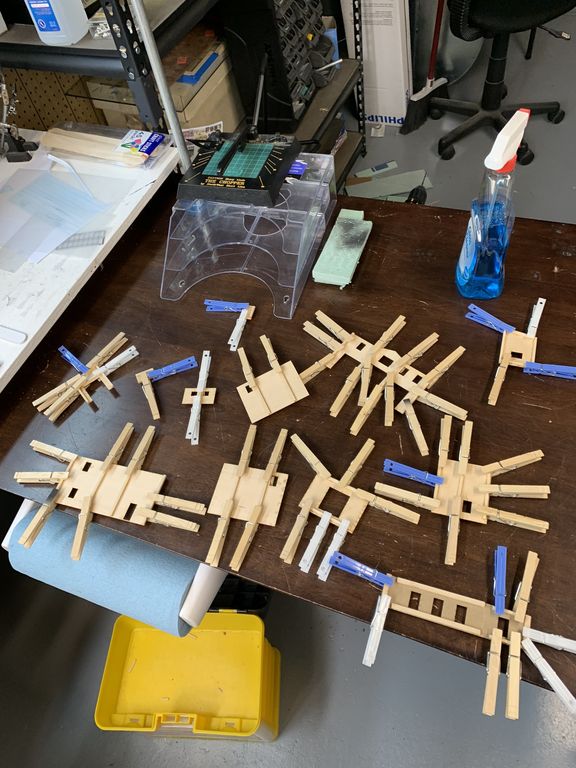 Next step is my most disliked portion but the most necessary. Bracing all the walls. I have a few 100 clothespins I use for this task. I try to brace all the walls and prime all the castings in one sitting so I can let both things dry overnight.