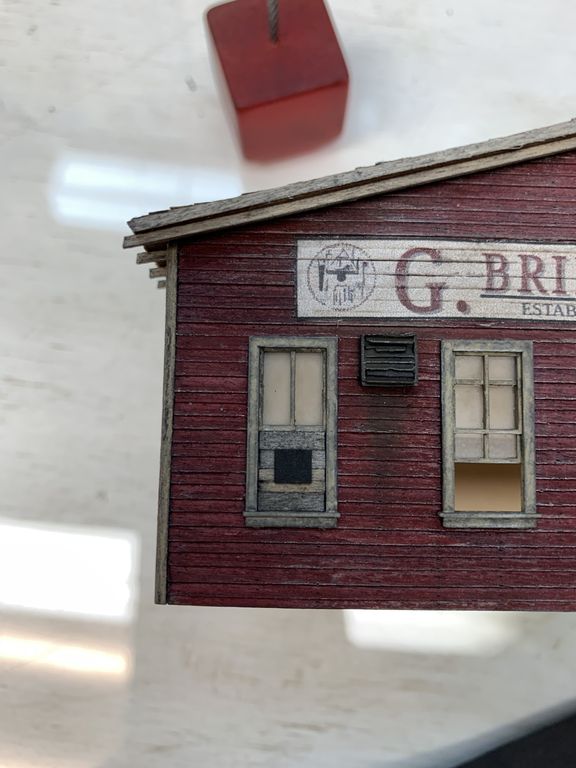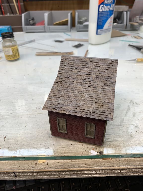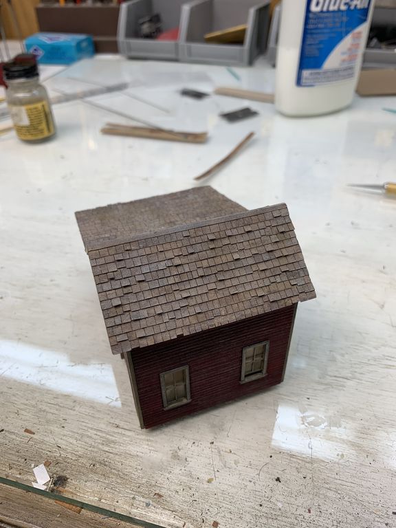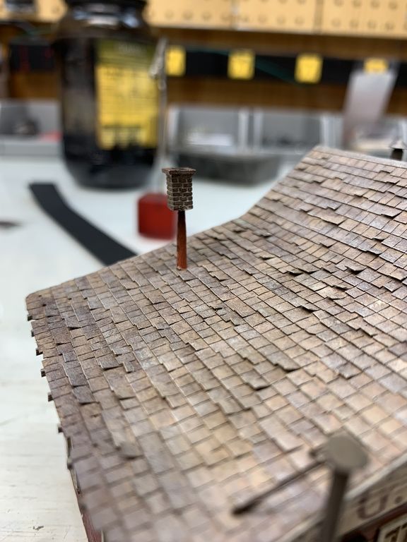 I colored the shingles first by dabbing different browns on the sheet with a paper towel. This is directly from the O'Neills instructions. I was a little unsure about it at first but once I start applying them I liked the result. After they were on the roof I dulled them with so A&I and white drybrushing.