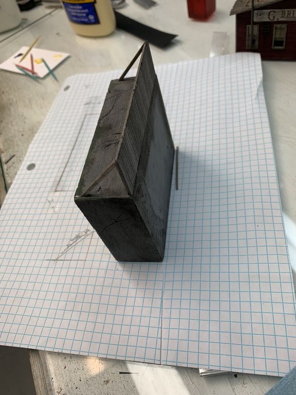 I wanted overhang on all sides but the part that meets the building. I use a wood piece as guide to keep everything straight and on the same plane. This is a technique I learned from Sierra West. This wood block is probably a left over from one of Brett's kits.