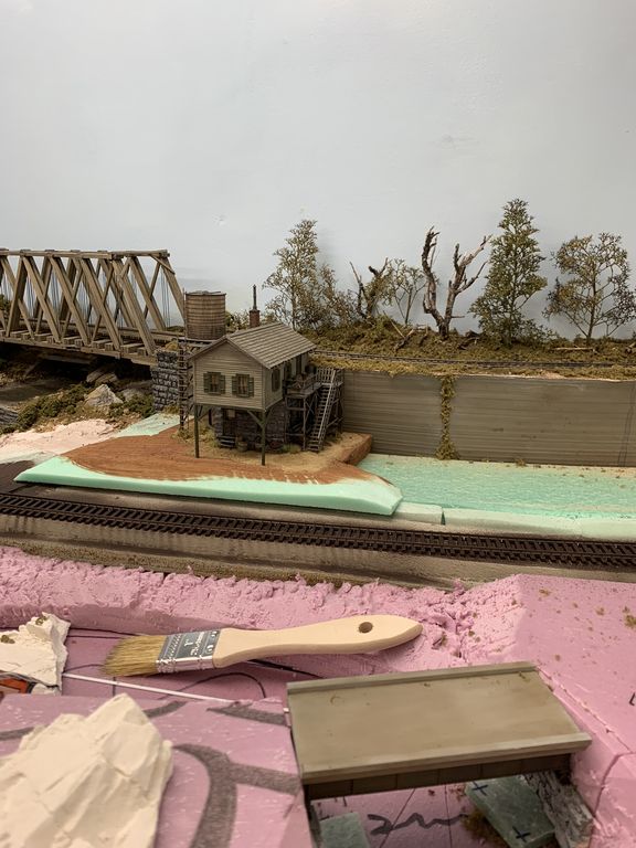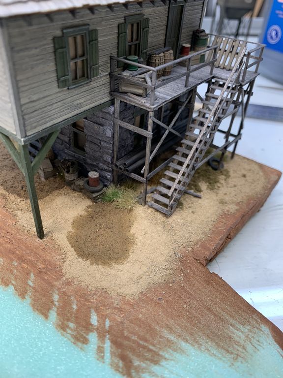 Ladders are in place and the tank structure is glued down. The scenery under the overhang is still wet. I added the little stairs under the front door.