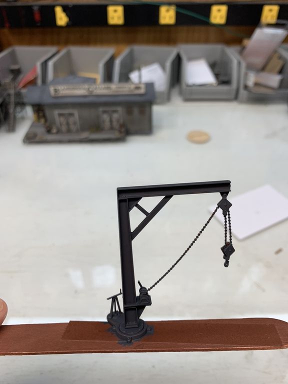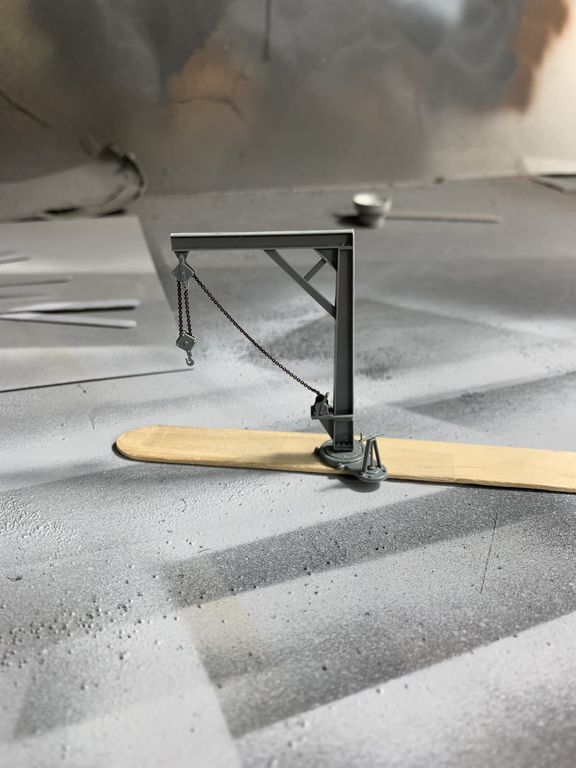 I got a few things done last night and today. I put together a Tichy crane and a little water tower for the scene.