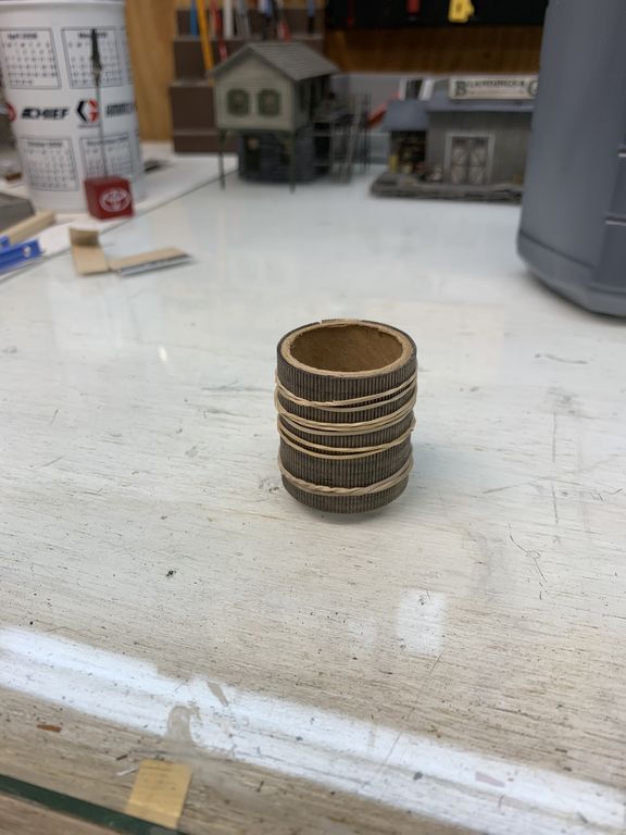 I used rubber bands to wrap the siding around the core which in this case is a cardboard center from a label maker used for printing oil change reminders for the corner of your windshield.