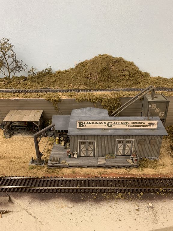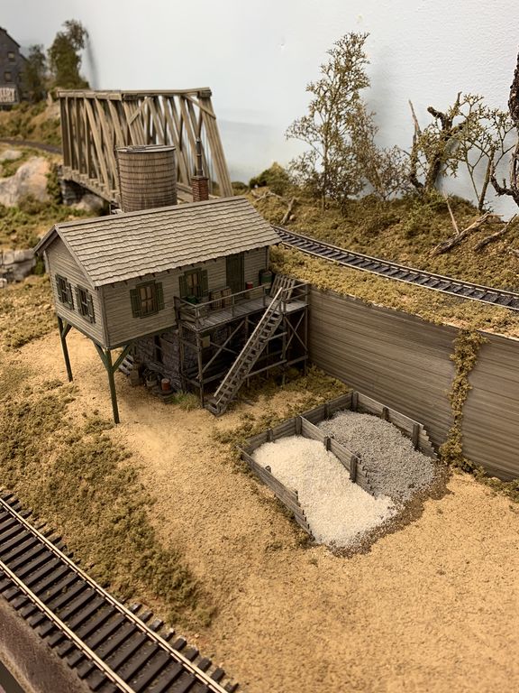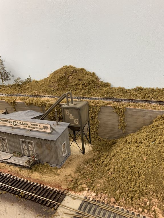 I added the scenery under the cement tank and I also added the piping that comes off the top. Originally it was designed to go into the rear of the right side of the building but I had no room so I redirected it into the side of the little bump out.