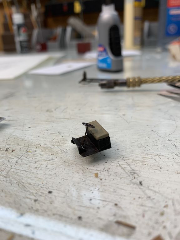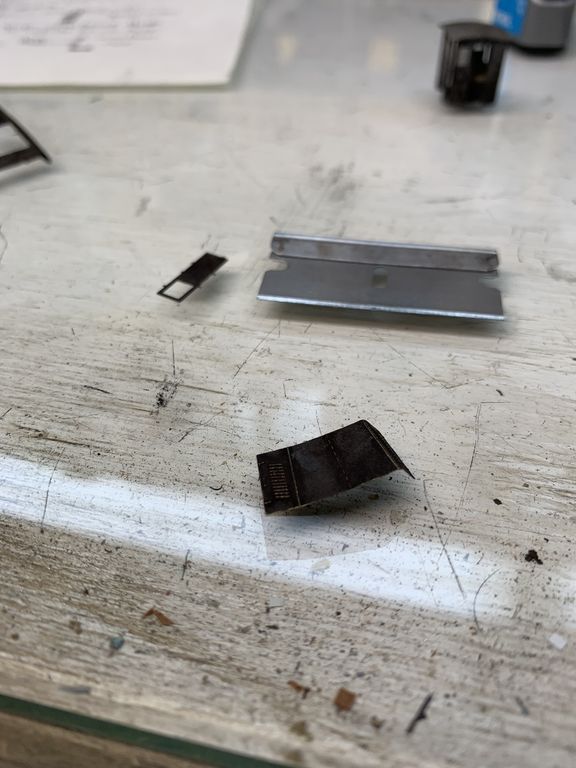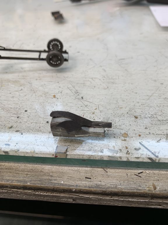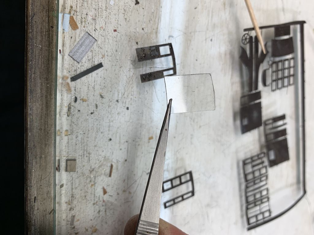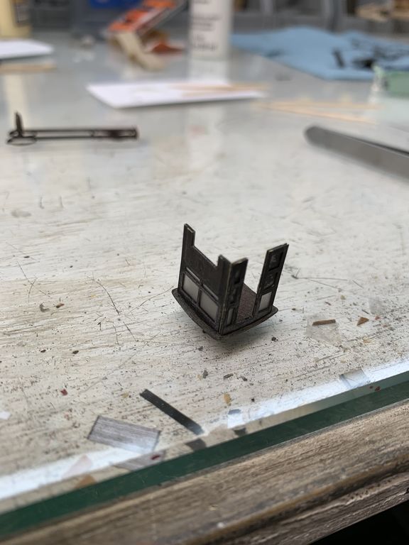 I started working on the cab while the frame was drying. This piece was made by laminating a piece of clear acetate between 2 section of brass sheet.