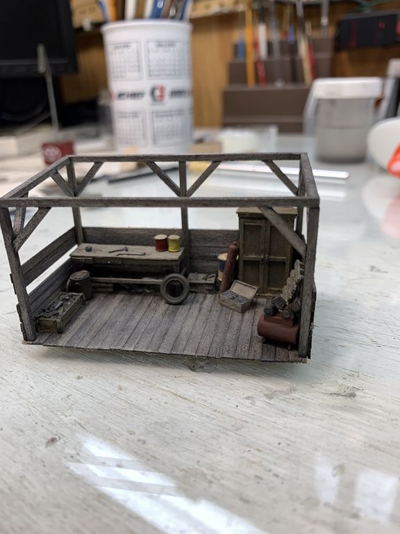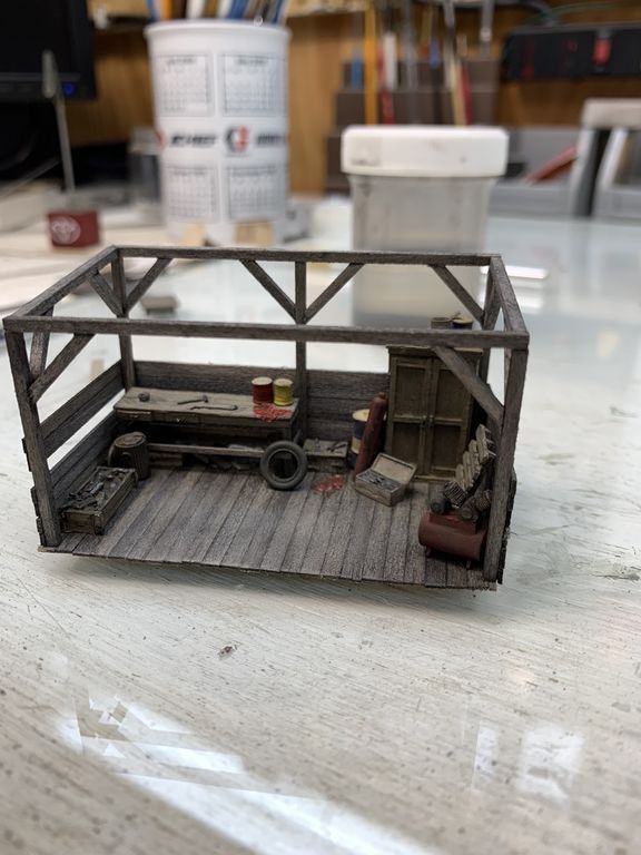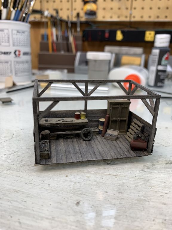 I started to get everything together but thought the scene was missing something in the area between the storage shed and the office building so I scratched up a little shed with some workbenches for small repairs to machines or vehicles.
