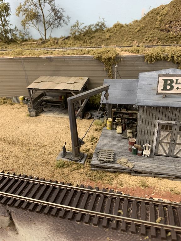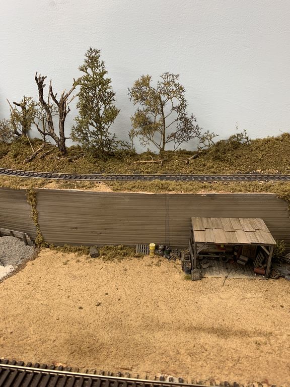 I added some junk around the little shed. The water stain down the concrete wall was not intentional, it's from the diluted white glue I used to secure the foliage at the top of the wall. I need to blend and cover it up some I think.