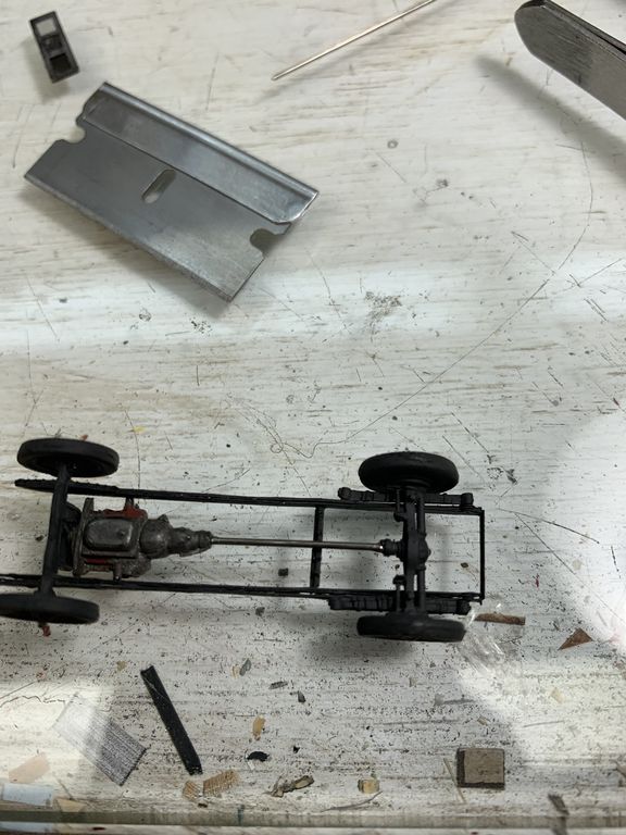 Trying to match the angle of the driveshaft between the transmission tailshaft and the rear axle yoke was very difficult. The engine/trans assembly is lead so it wants to roll while the glue is setting. I did my best here.