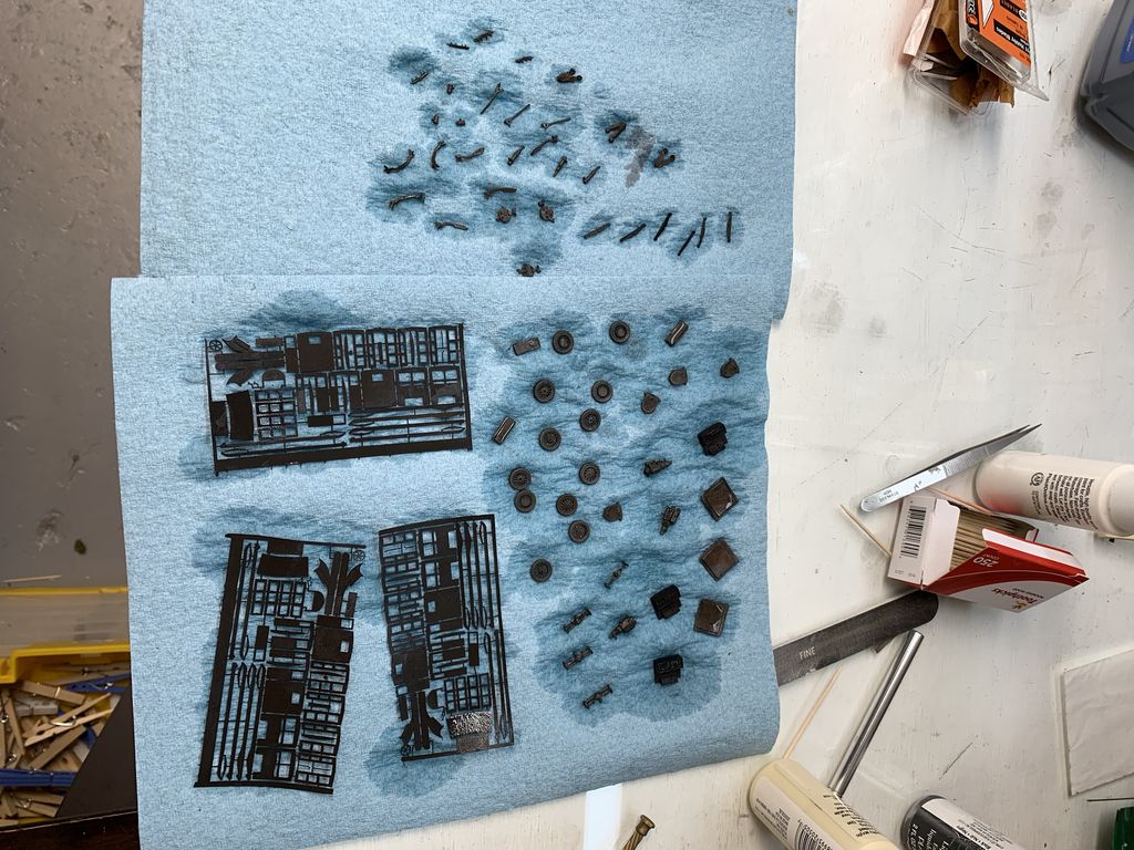 I blackened all the parts. Jaks Pewter Black was used for the lead parts and Brass Black for the brass.