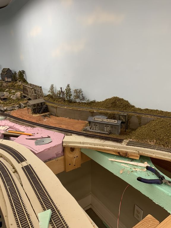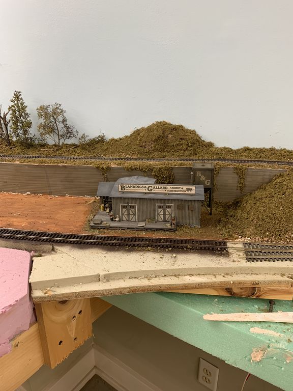 While I waited for the shed glue to dry I installed the warehouse on the layout. The scenery is still wet in this photo and I haven't added any of the details around the building yet.