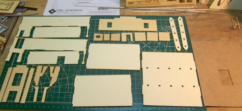 I'm going to vary from the instructions and begin assembly of the bus terminal structure, which is really the main event in this kit. Most of the walls are the white task board material. I sorted out all of the needed walls and a few of the other larger laser cut pieces. As with the shoe factory, I marked the wall number lightly on each piece to minimize going back and forth between the instructions and the parts diagrams.