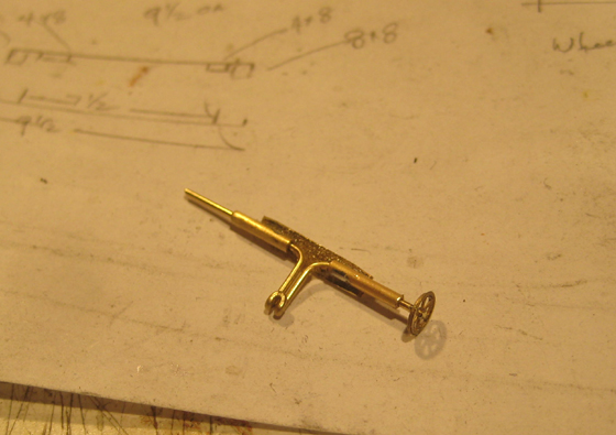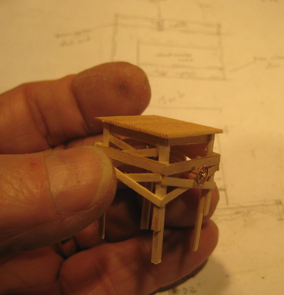 Got the scaffolding and elevator done.   Here is the operating mechanism for the elevator. I had all these ideas for how to run chains or thread and wind it around the wheel shaft.  Then I got to thinking about all the cool animations stuff the Fisher Price does for children's toys.  They are monuments of simplicity.  Then it came to me.....