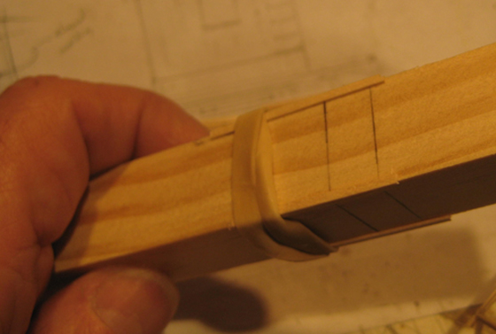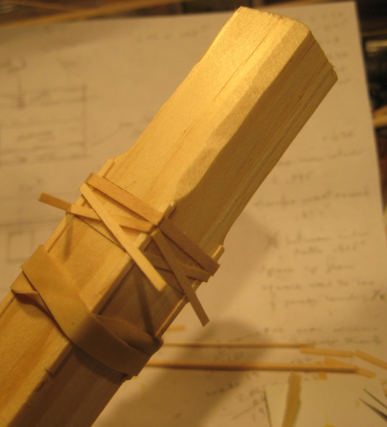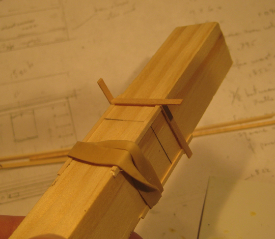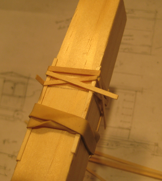 Next option ........ make a jig to hold it where it needs to be.  I cut a block of wood that is the size of the interior of the scaffolding.  The corners are L stock from Northeastern and cut long to shape later.   A rubber band holds in all there.   The pencil lines are square to the block so I only have to follow the lines to make it even all the way around.   The half lapping allows me to keep going.  Once painted the lapped ends will not show.