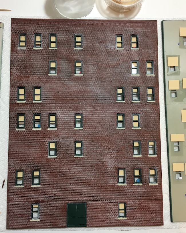 The wall facing the green building was from a different kit and came up a bit short.  I filled the gap at the base with a bit of balsa.  Once painted and hidden by scenery the patch will be invisible.