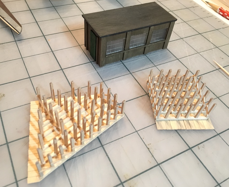 At the moment I am working on several augments for the building.  The roof structure is drying so that it can be painted and the windows installed.  I also started working on an appropriately oddly shaped loading dock.