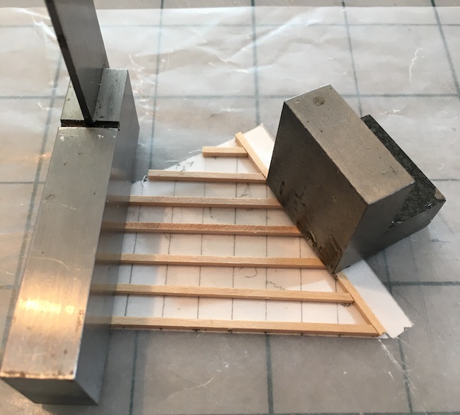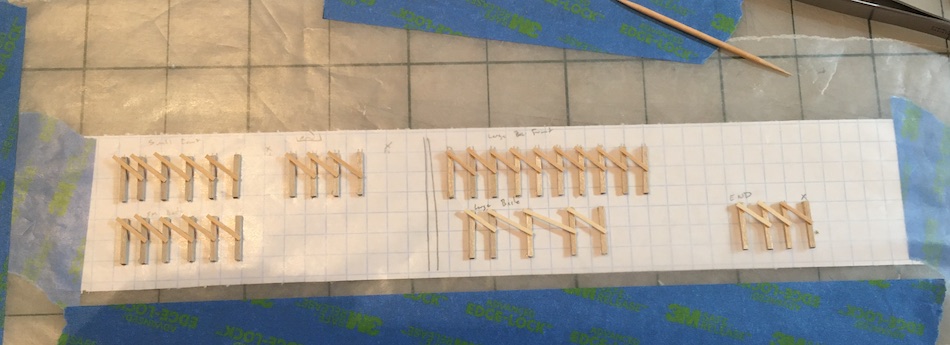 I laid out the spacing for the outer legs on some graph paper.   Then I covered it with waxed paper and glued the legs down with a drop of glue at each end.  I'll let these dry over night and then add angled bracing.