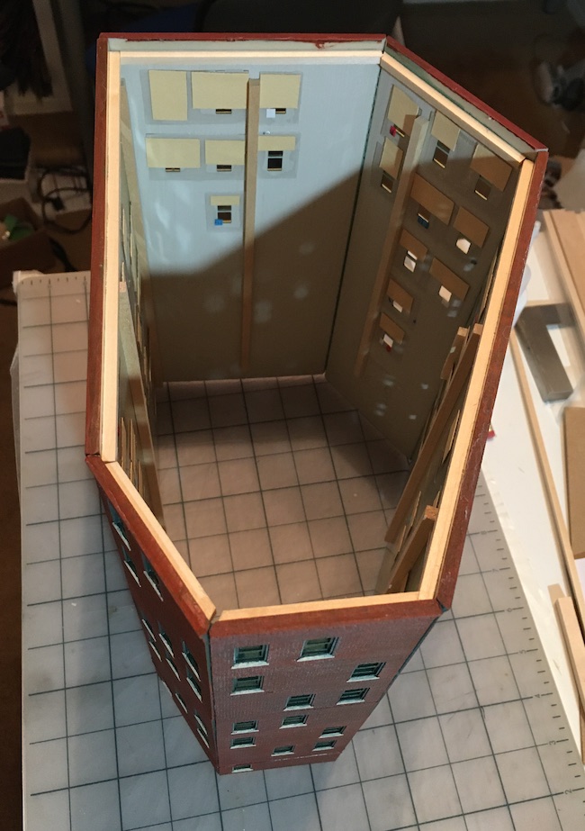 I rechecked the fit for the oddly shaped lot next to the curving tracks to finalize the shape, got out the gel superglue, and went to work assembling the structure.  This side will face the tracks.