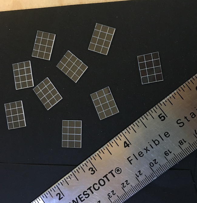 For the roof access structure I wanted to simulate glass block.  After several experiments I settled on these windows cut with my Cricut cutting machine.  I used the machine to score the pattern.  This material is brittle and easily snapped along the score lines to make individual windows.