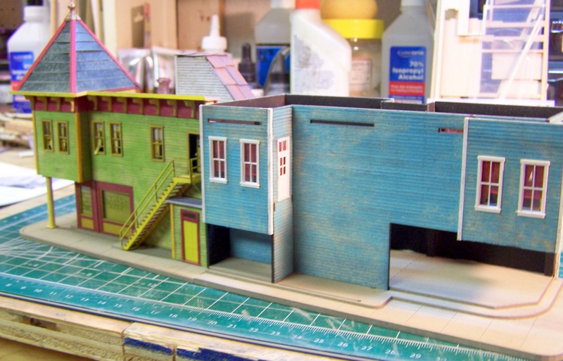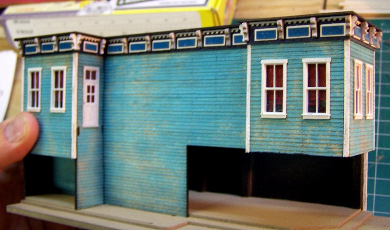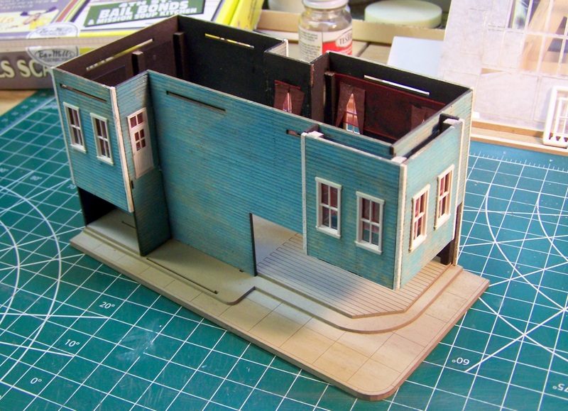 I have already begun distressing and bracing the walls of the next structure: the jewelry store with upstairs dancehall (Bar Mills Bail Bonds).