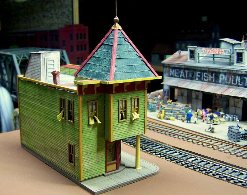 Here is the structure with stairwell, news-stand and store entrance installed. The store entrance and news stand involved painting the different overlays contrasting colors, then putting them together (they are self-stick components) for the installation. The biggest step is planning out what colors to use.