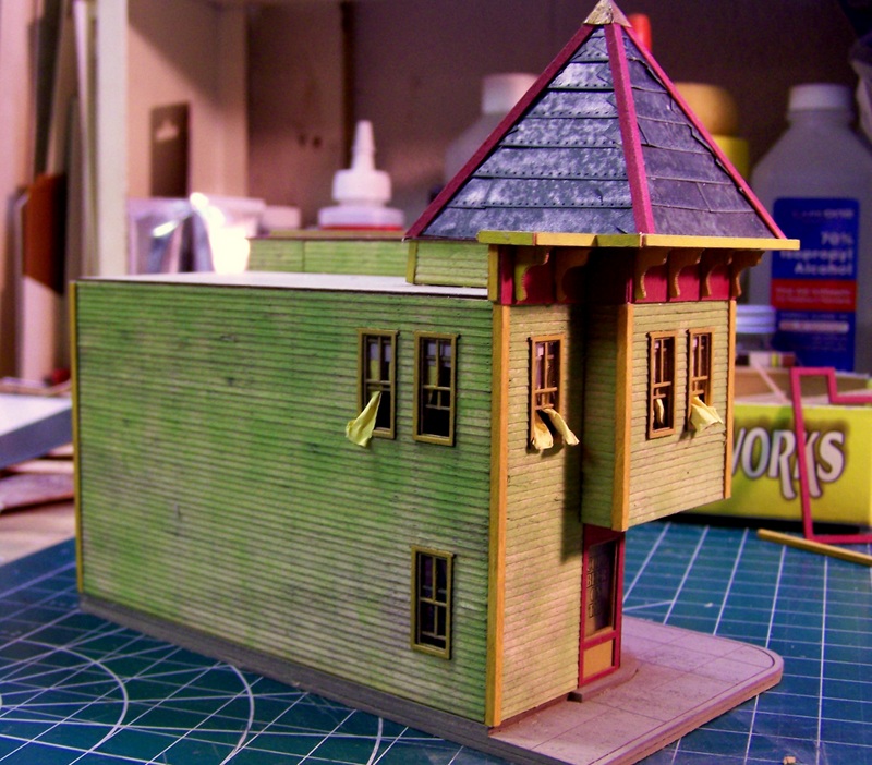 And a few pictures of the tower roof in place. I used up about 60% the rolled roofing supplied, but I think I have enough leftover from the FOS Terminal kit to cover the flat roof.