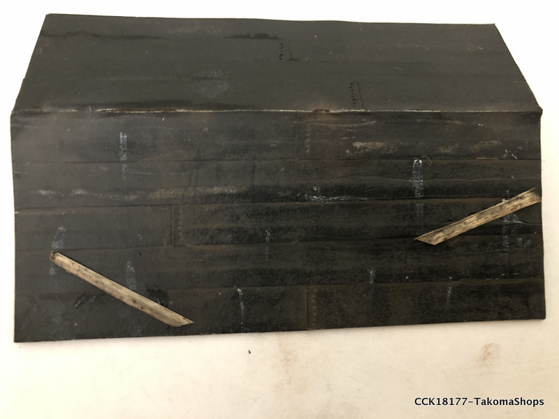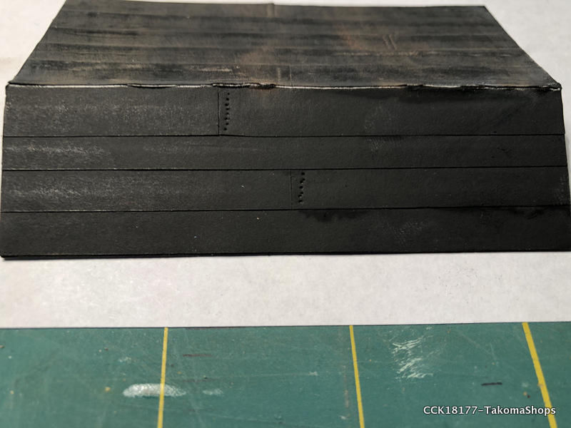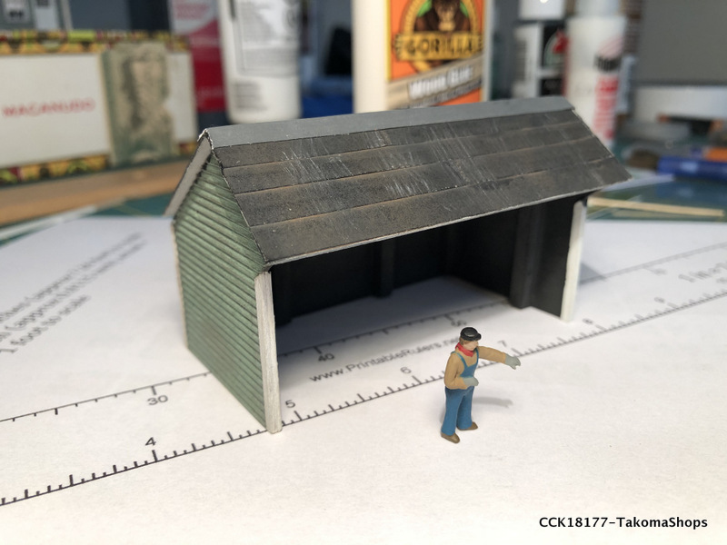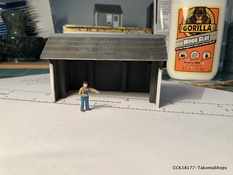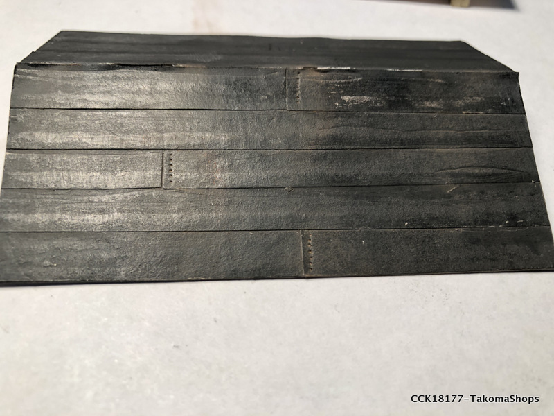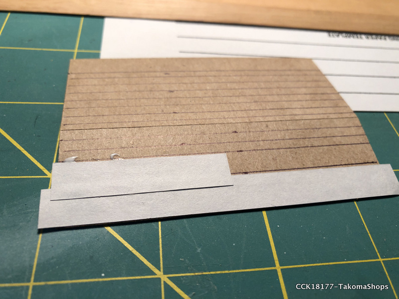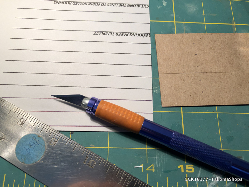 The little supply shed has a tar paper roof instead of shingles. The kit provides a sheet of paper used to simulate the tar paper. The sheet is already ruled so it is easy to cut out the required strips of tar paper.