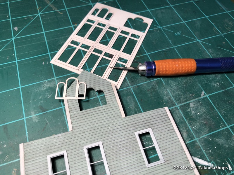 Some of the windows and doors for this kit are assembled from peel-and-stick laserboard and cardstock. I've only ever done this once before and I had so-so results. The stuff is very delicate and it is tricky to get the peel-and-stick backing off the pieces. Furthermore, the "castings" don't key into the holes so one has to be very careful to align everything properly. However, the results are nice and one ends up with unique windows. I think that is what I liked best about this kit, the windows and doors are unique.