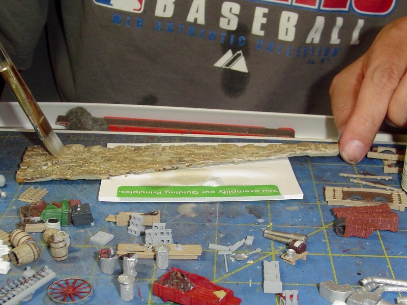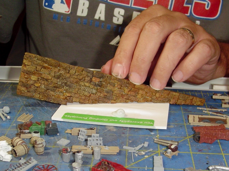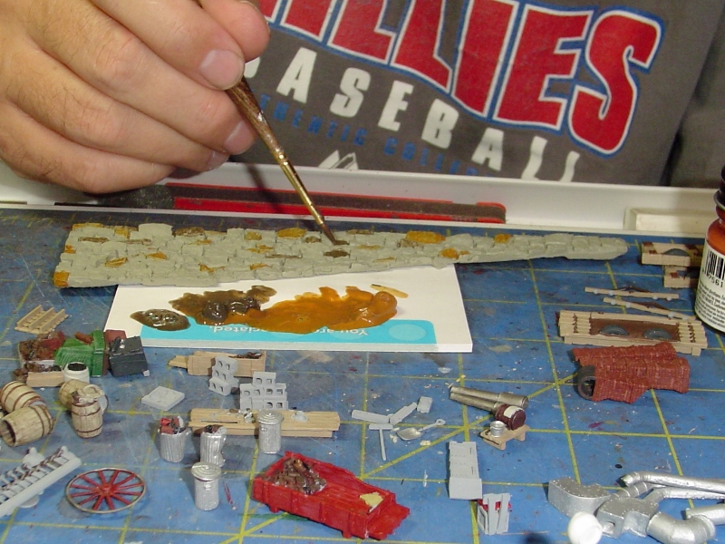 Okay, I have actually been working on this one recently but I've been focusing on painting the detail castings so there's been no "glue on wood" at this point.   :)   I'm going to walk you through the steps I took to paint the stone retaining wall that runs along side the road.  I consider this a happy accident.  I've never been pleased with the results I get when I paint stone walls but I think I lucked out on this one.