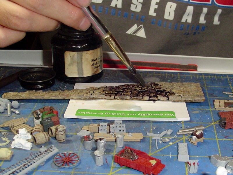 Painting it with Concrete was as far as I went with regards to sticking to the instructions.  The instructions then call for painting some individual stones with Floquil Oak Stain and some with a darker gray after which A&I is applied and then drybrushing.  I opted, however, to paint the individual stones with cheap craft store acrylics: Raw Umber, Burnt Umber and Burnt Sienna.  (If you follow my lead on this don't worry about being too precise painting the stones.  Also, blend the various colors together to create even more shades of reddish browns as you paint the stones).
