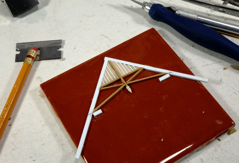 I knew the Victorian Gothic boarding and brackets (also called Apex trim) at the gable ends were going to be difficult. I glued two pieces of square styrene strip at the same gable roof angle (actually about 88 degrees) on a ceramic tile as a jig. Used card first as test pieces to get approximate lengths and angles.