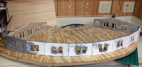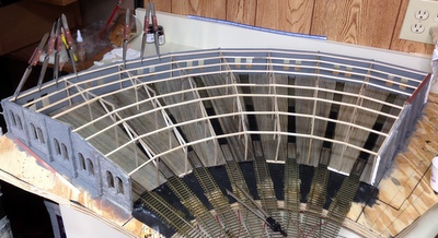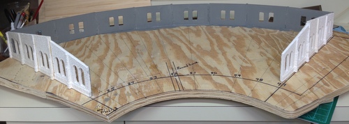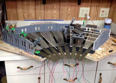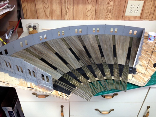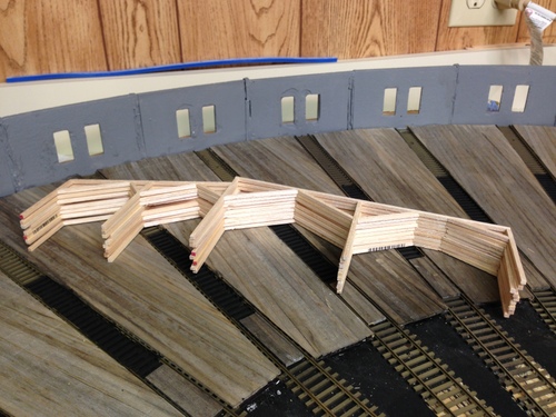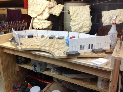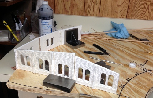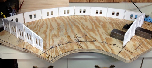 Next came the process of gluing the wall sections together.  I only got four sections together and I had to see what it looked like in place on the layout.