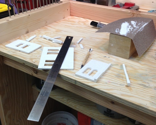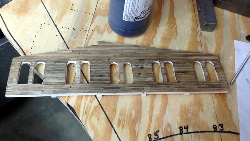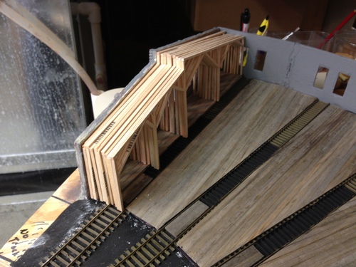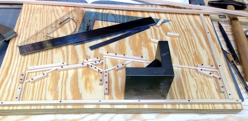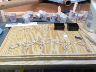 The first step in the interior framing was to build a gluing fixture so each one of the trusses was the same.  I have built many fixtures from styrene this was an experiment with building it out of wood. For a fixture this size I found it faster and easier out of wood.
