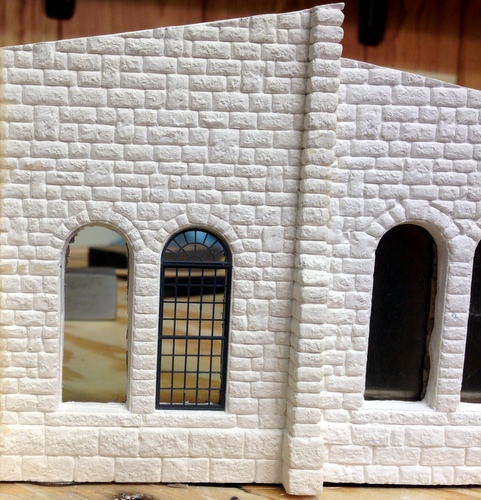 The roof pitch had to be cut into the side walls and the windows had to be fitted. Also, each casting had to be squared and fitted to the next.  This created lots of plaster dust.